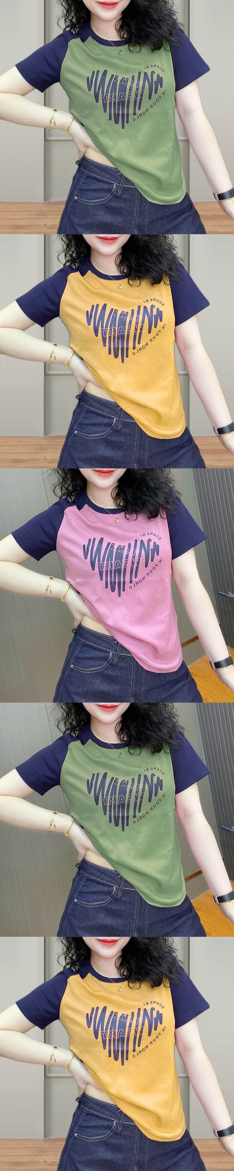 2025 new summer cotton round neck short-sleeved shoulder sleeve T-shirt women's print contrasting colors versatile and thin loose top