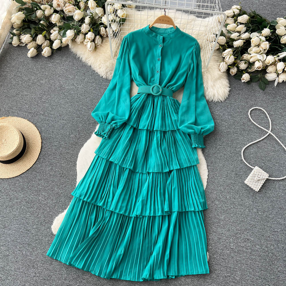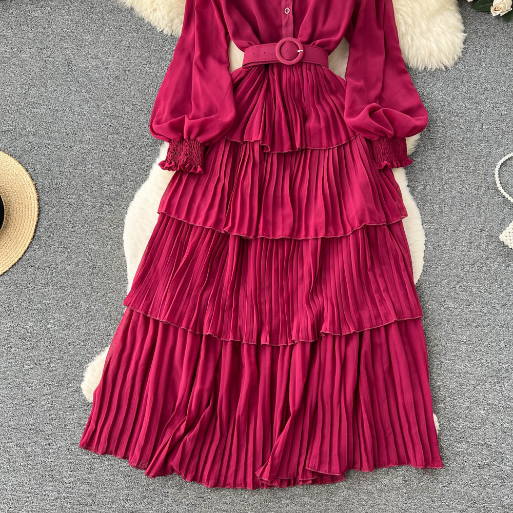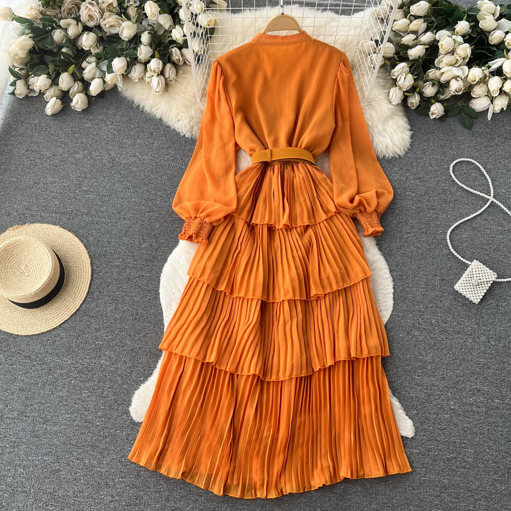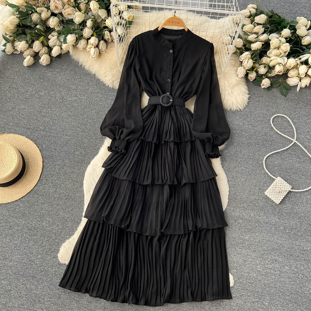 2025 spring and summer new big pendulum long-sleeved chiffon dress women's waist temperament Platycodon coffee break cake long skirt tide