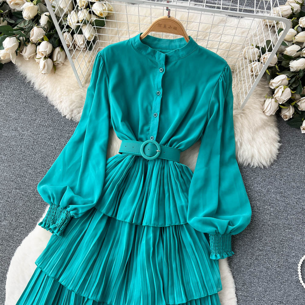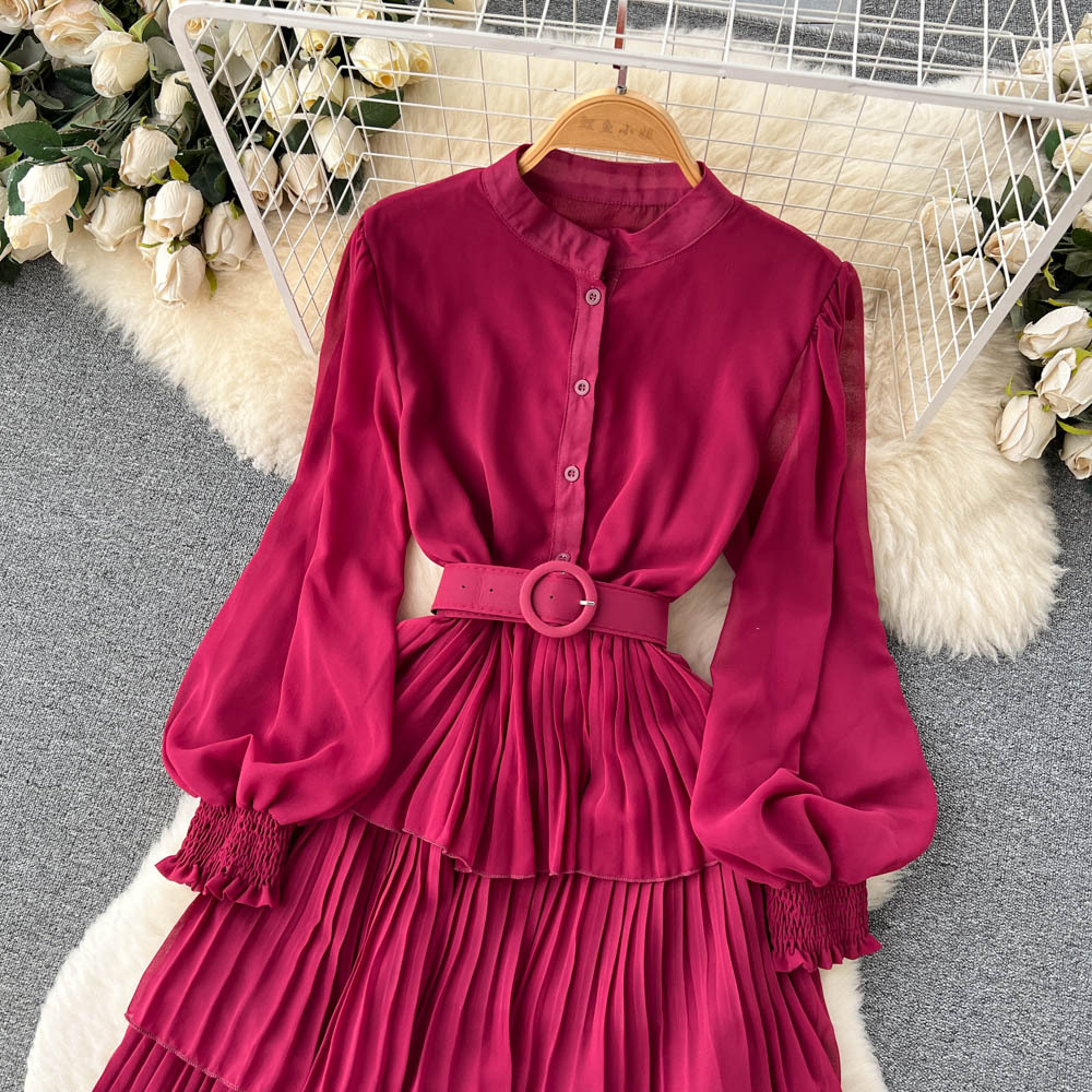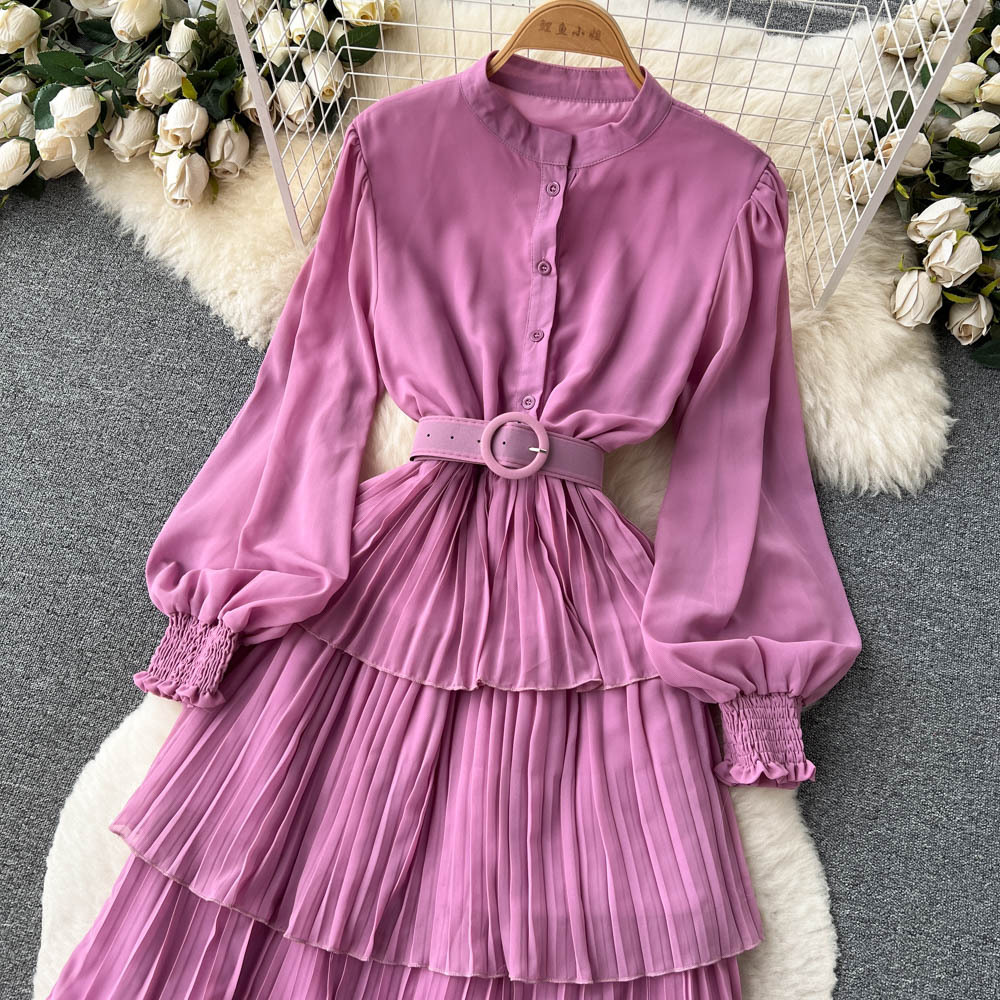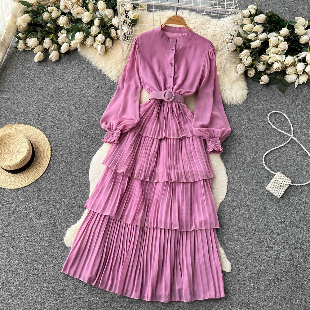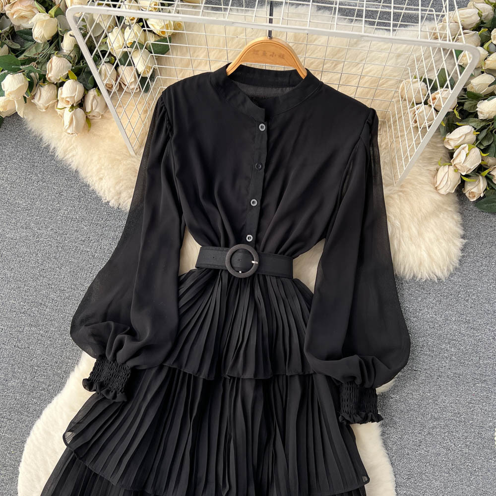 2025 spring and summer new big pendulum long-sleeved chiffon dress women's waist temperament Platycodon coffee break cake long skirt tide