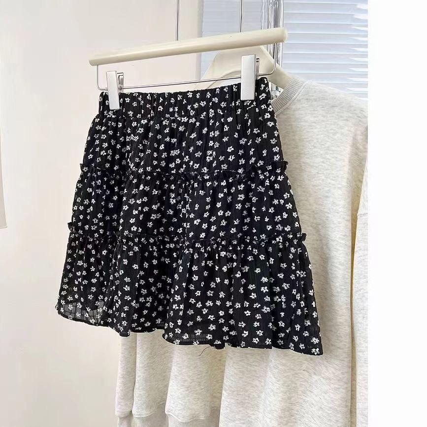 Black floral cake skirt spring and summer small 2025 high waist and thin anti-light puffy skirt