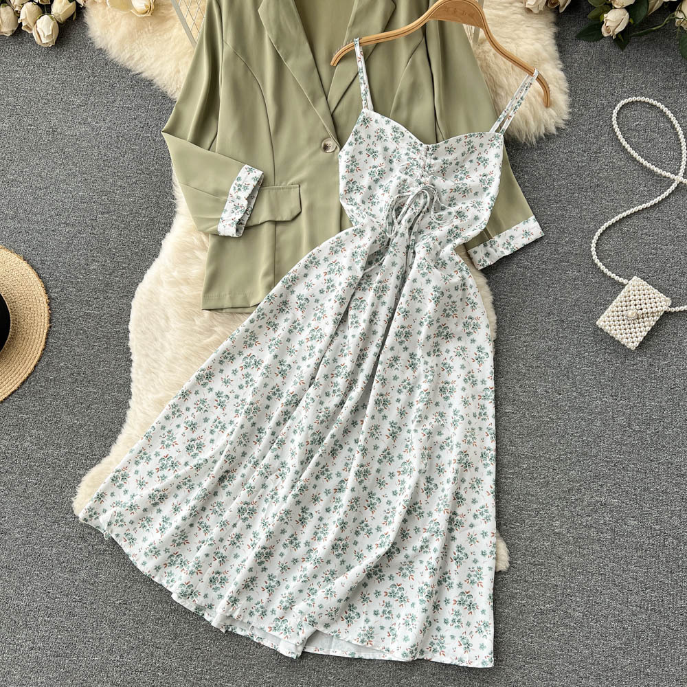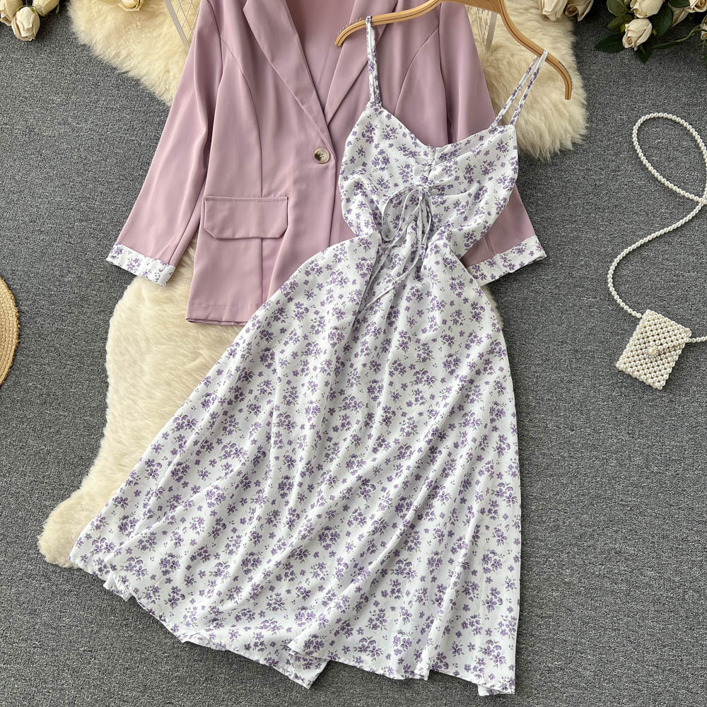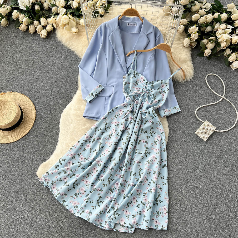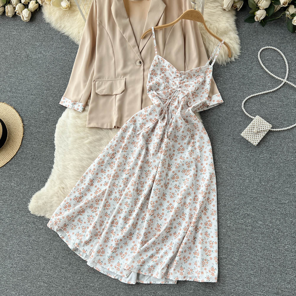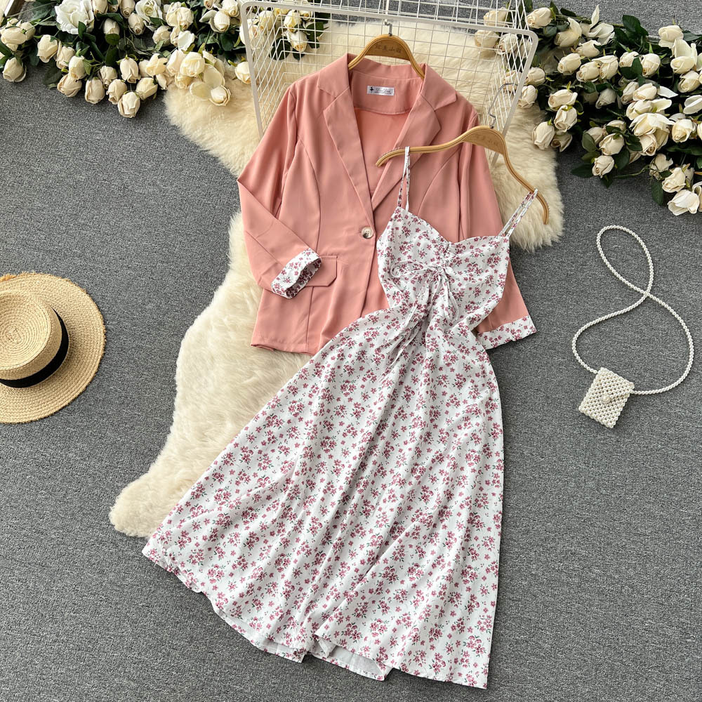 French high-end loose, sweet and salt suit women's long-sleeved suit jacket + floral fairy suspender dress