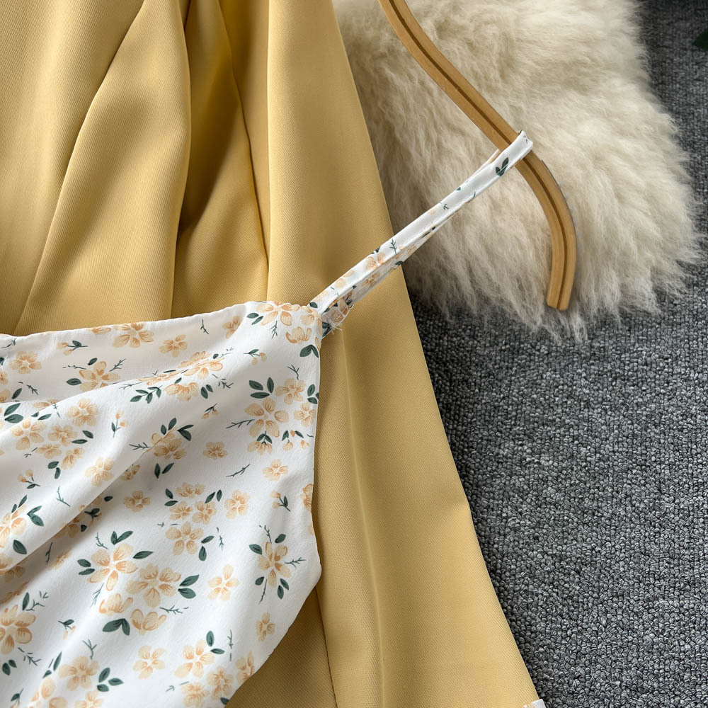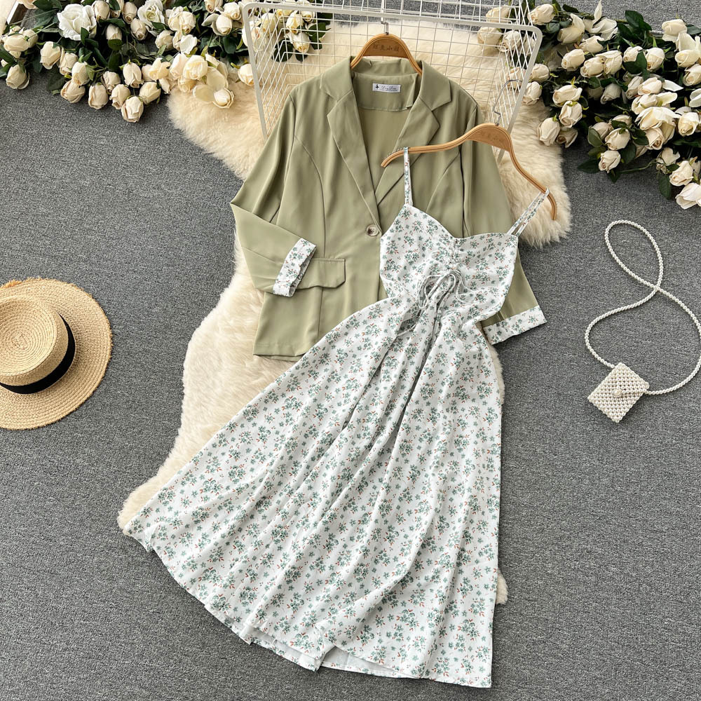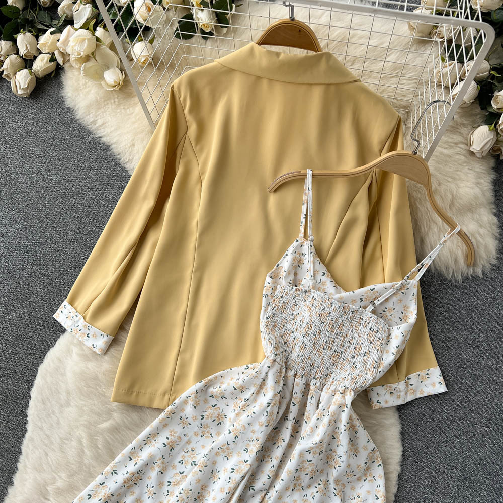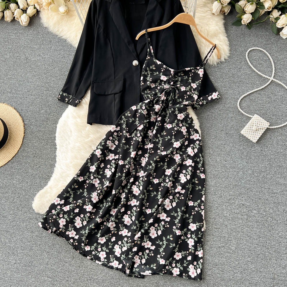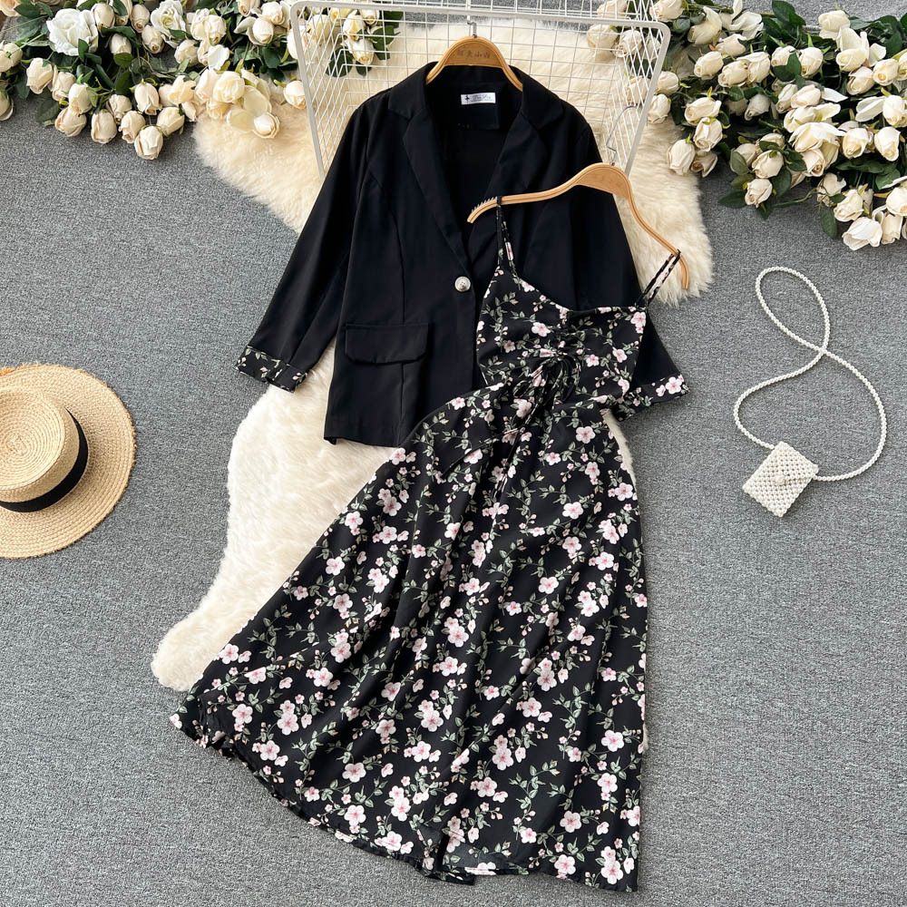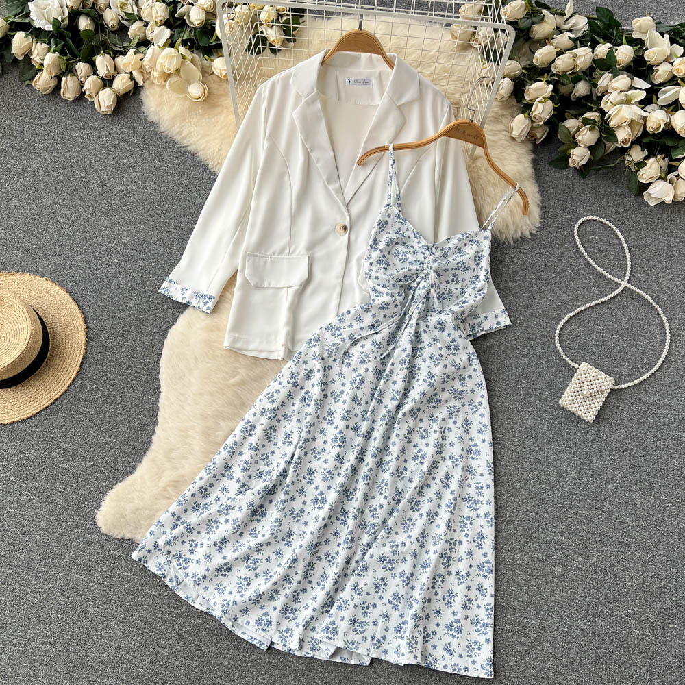 French high-end loose, sweet and salt suit women's long-sleeved suit jacket + floral fairy suspender dress