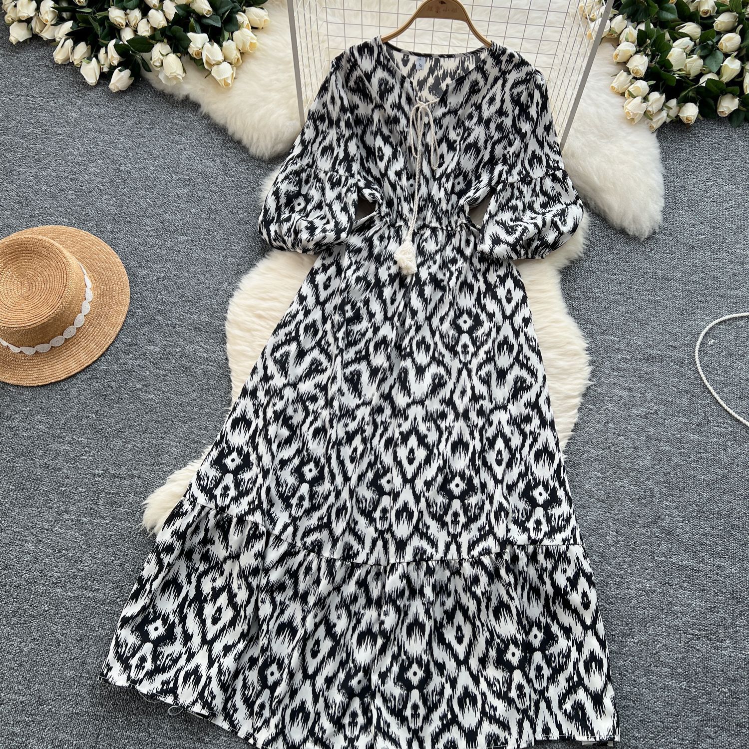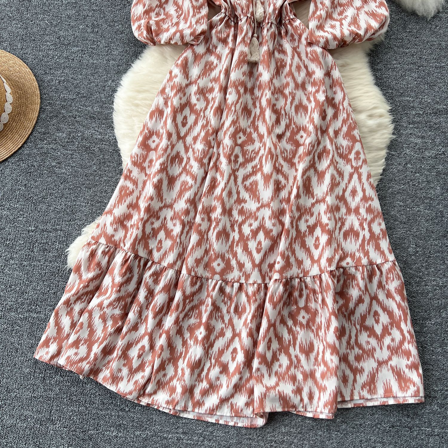 French retro bubble sleeve floral dress women's summer strap waist design sense light luxury temperament big swing dress