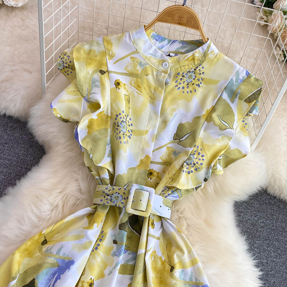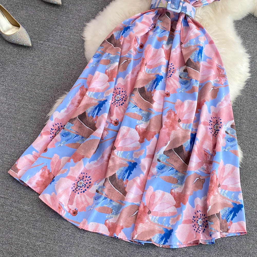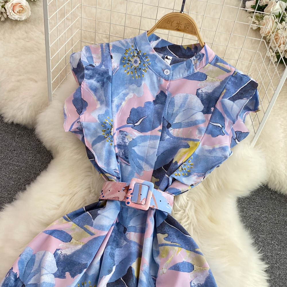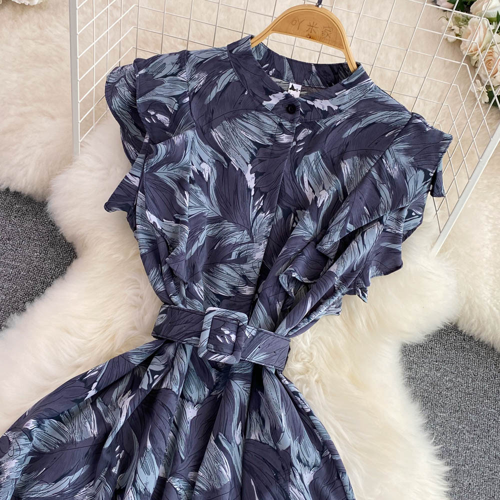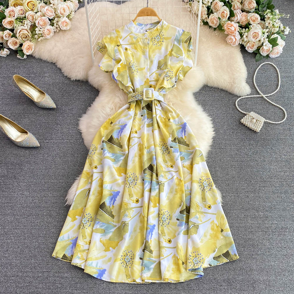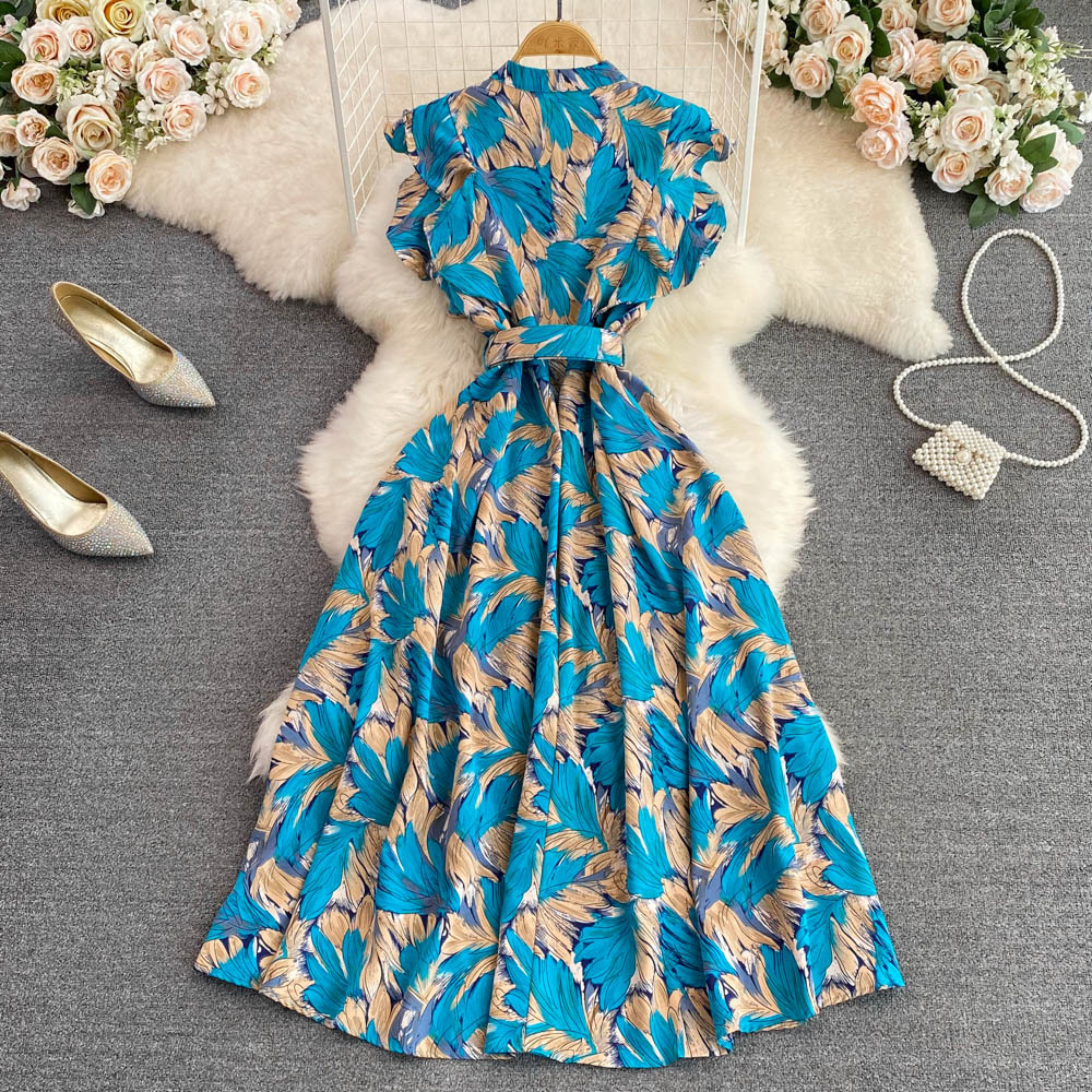 Gentle wind stand-up collar waist and thin printed A-word big pendulum dress 2025 summer high waist elegant temperament long dress