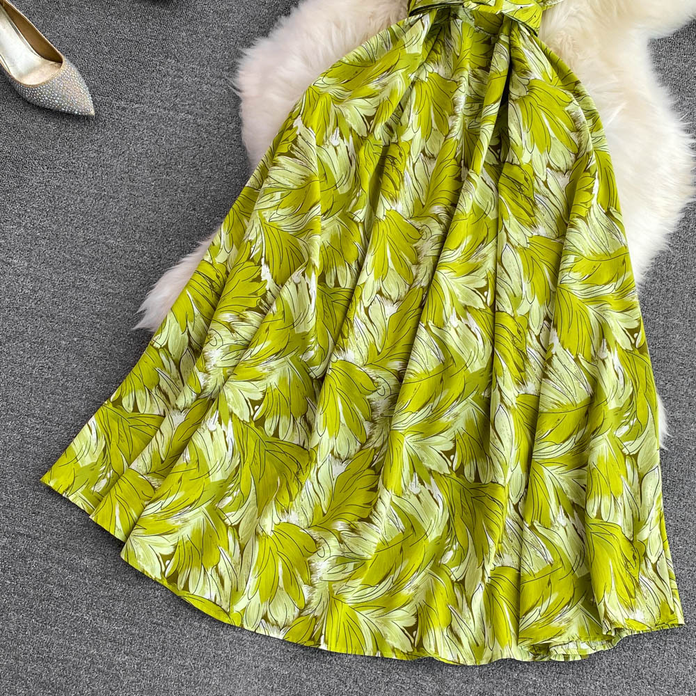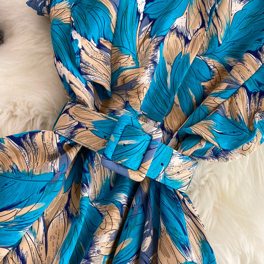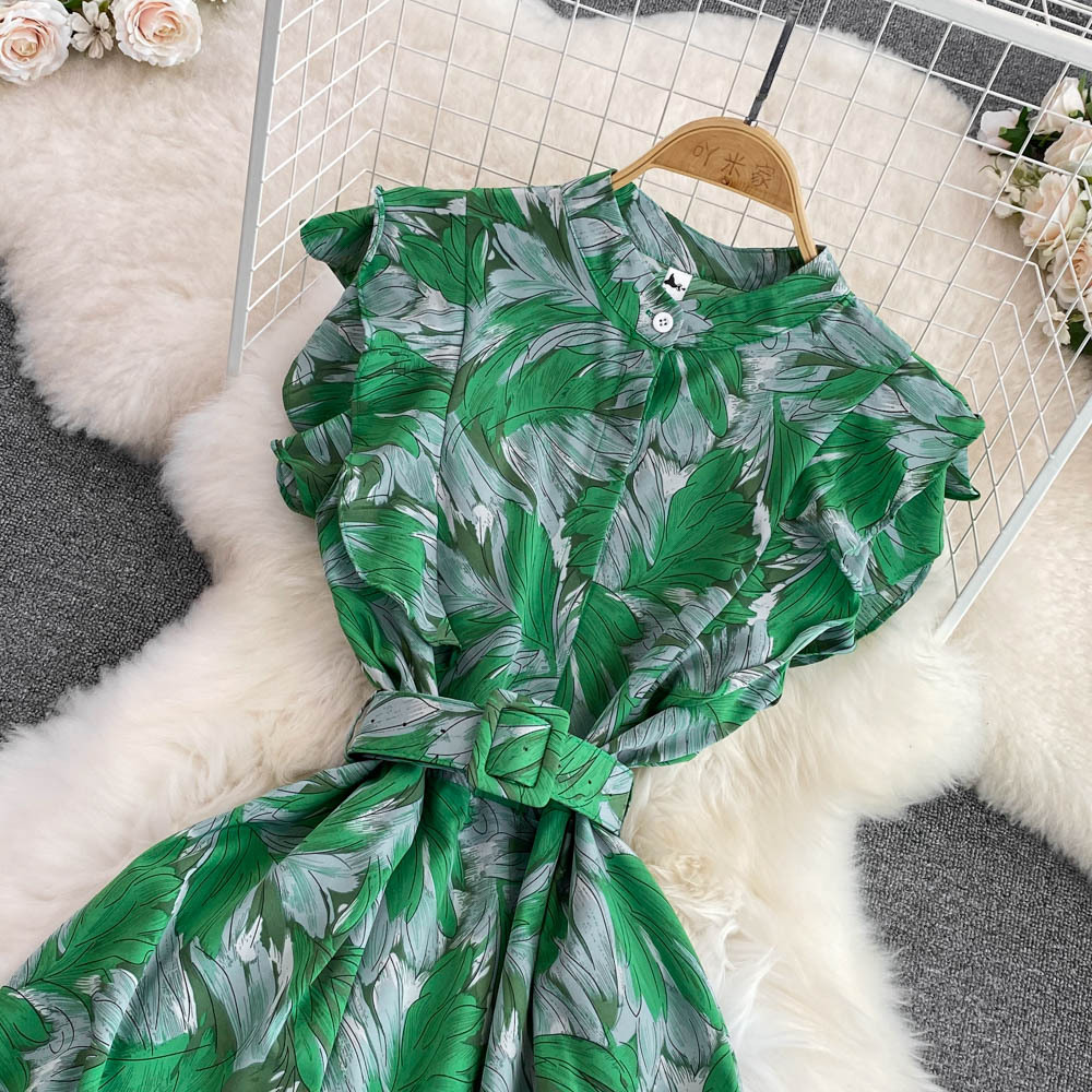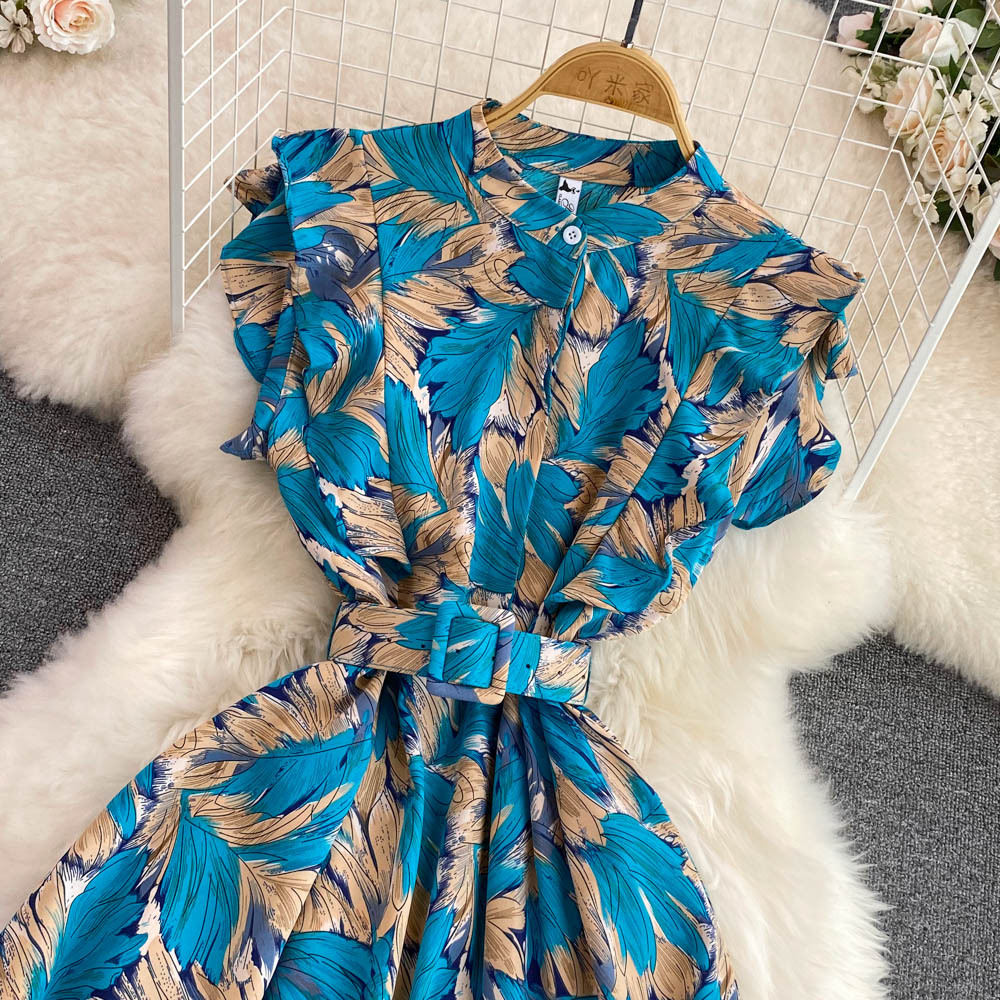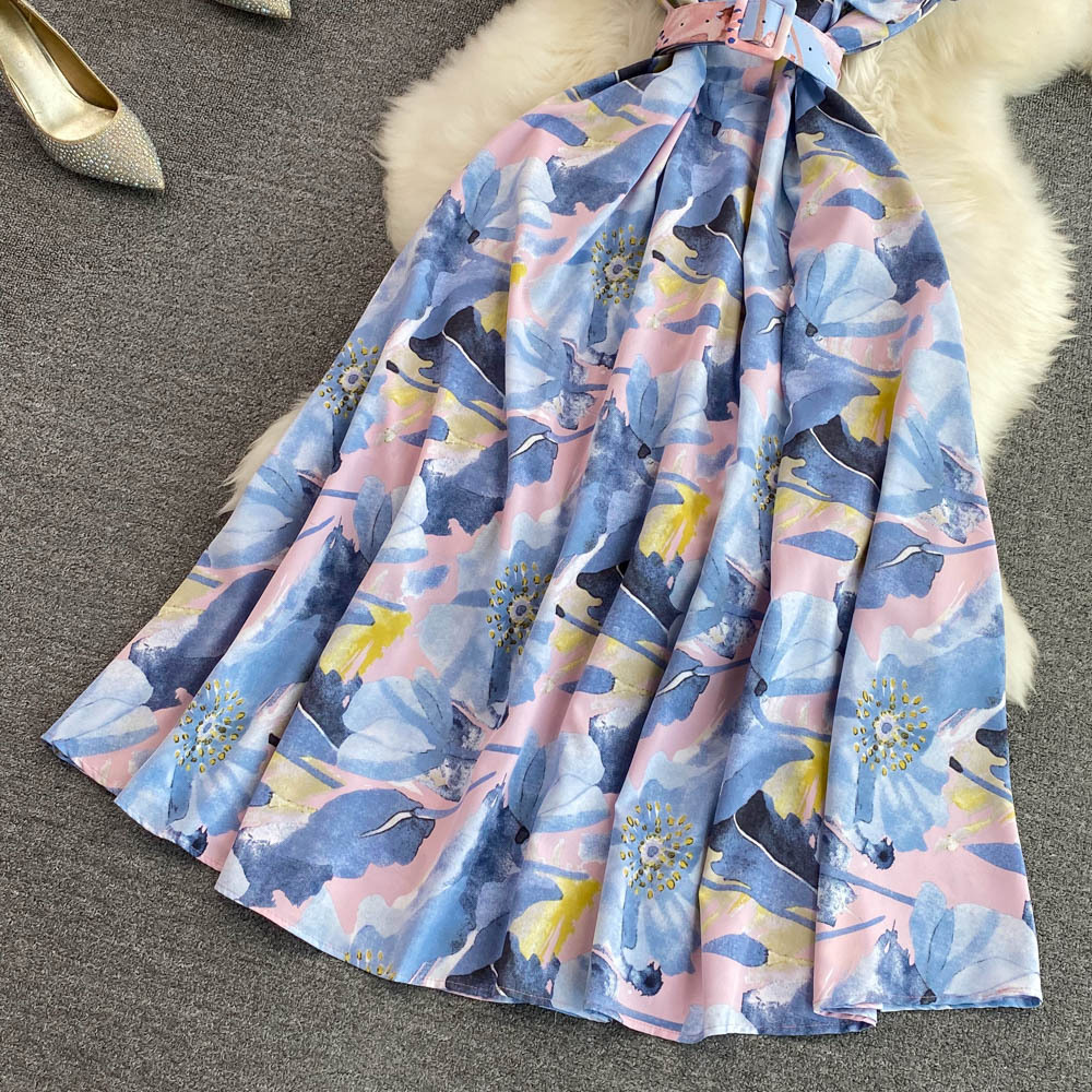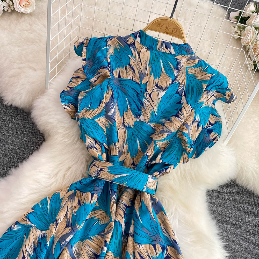Gentle wind stand-up collar waist and thin printed A-word big pendulum dress 2025 summer high waist elegant temperament long dress
