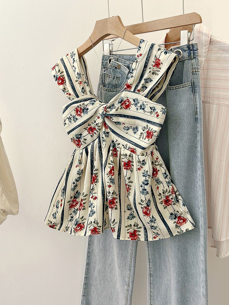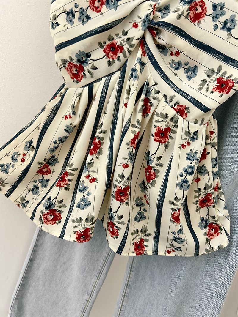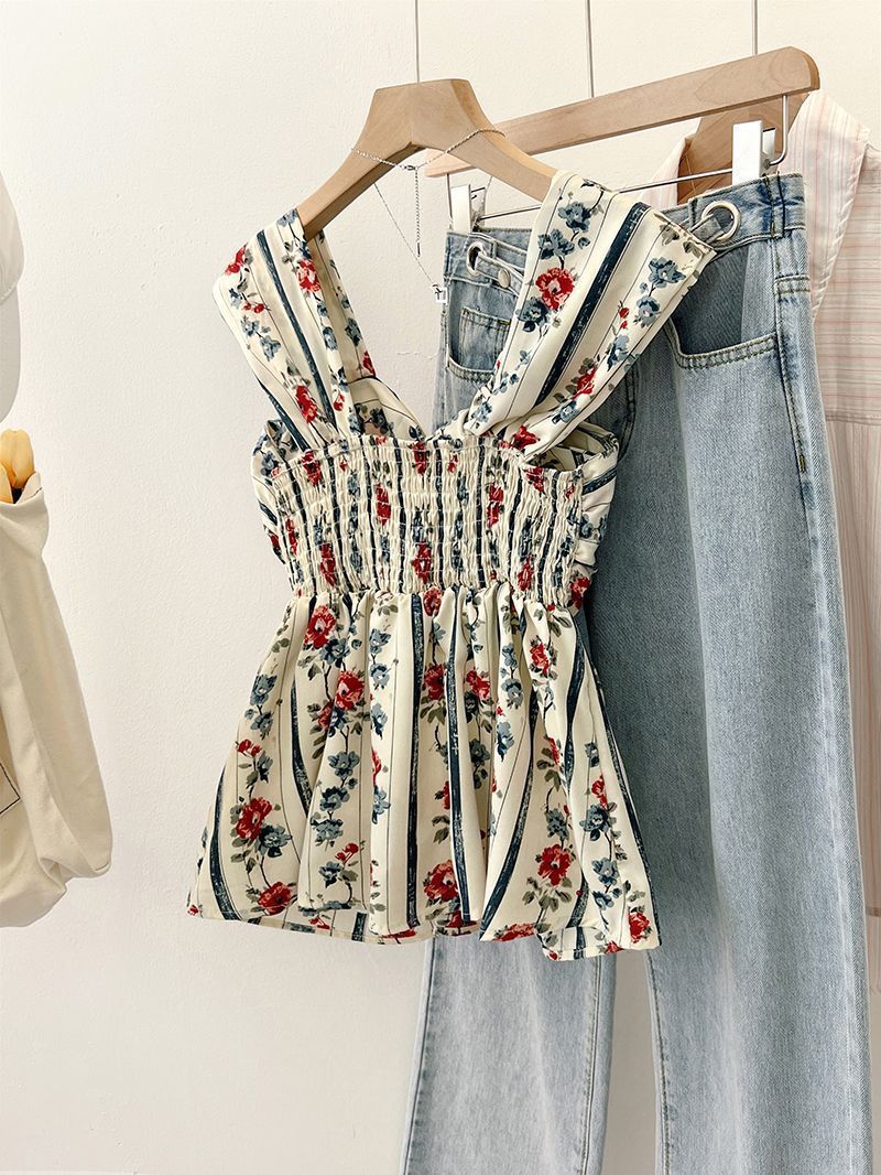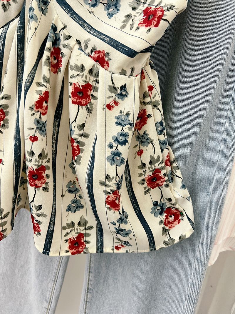 Ladies style retro V-neck kinked floral shirt women's summer new pastoral sexy waist small fly sleeves ins top