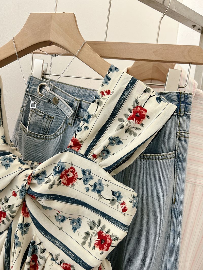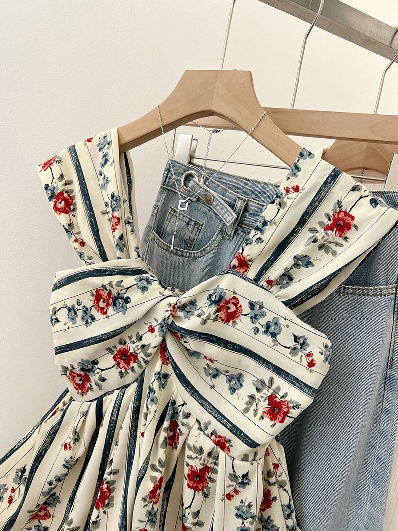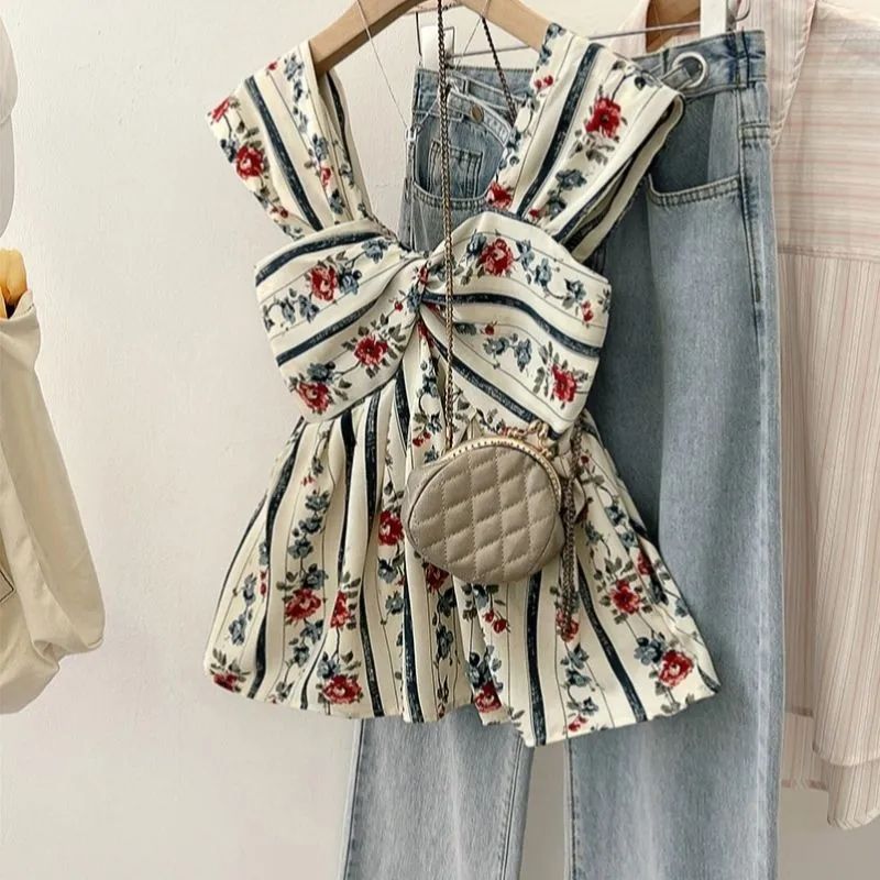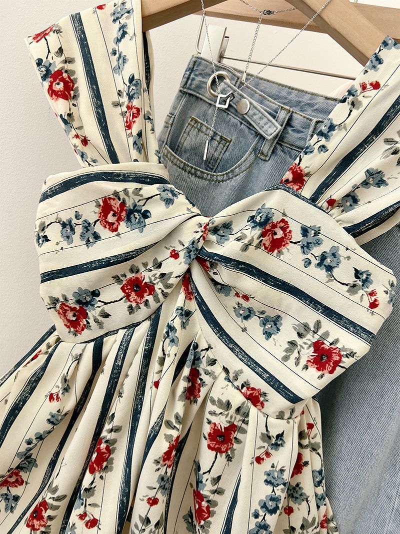 Ladies style retro V-neck kinked floral shirt women's summer new pastoral sexy waist small fly sleeves ins top