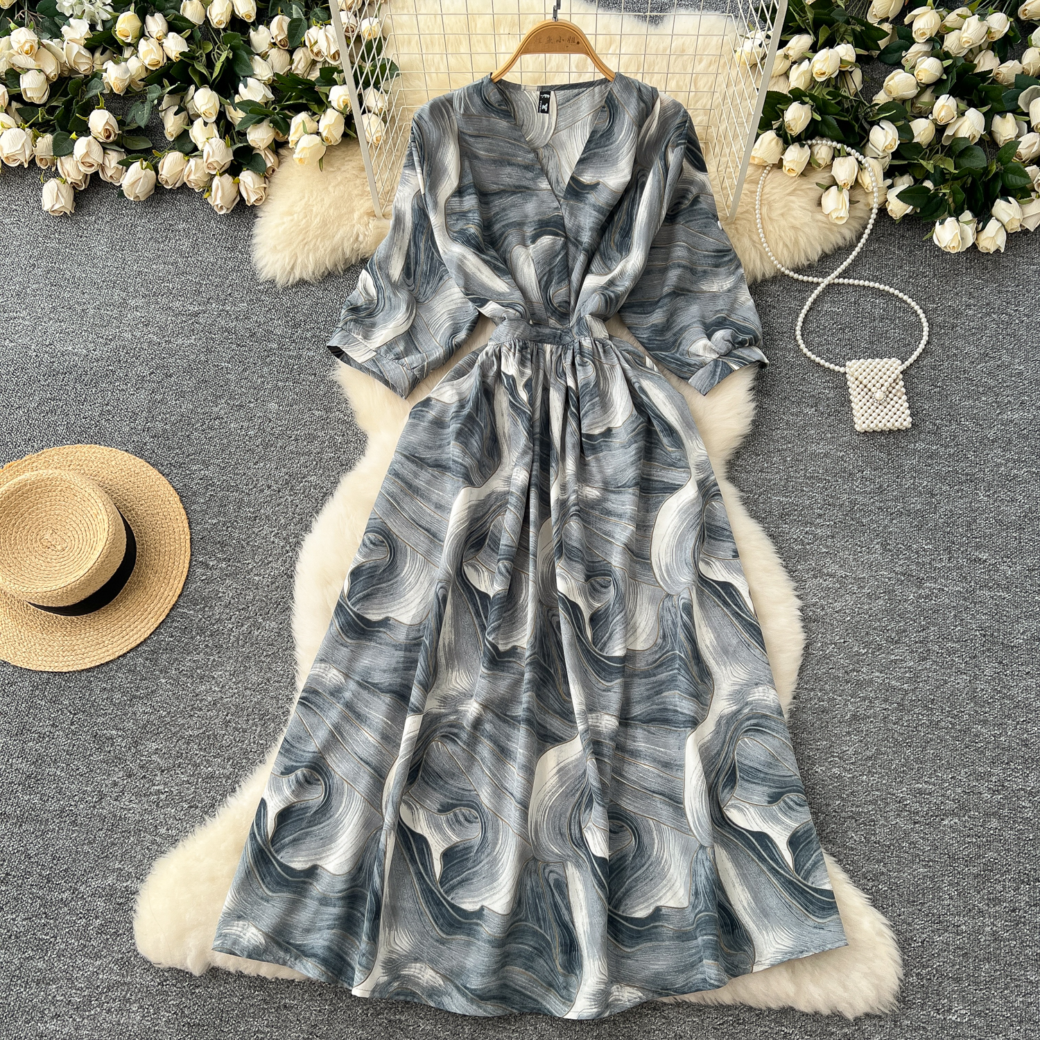 Light and mature style niche retro V-neck seven-quarter sleeve printed dress women's French waist and thin temperament A-shaped long skirt