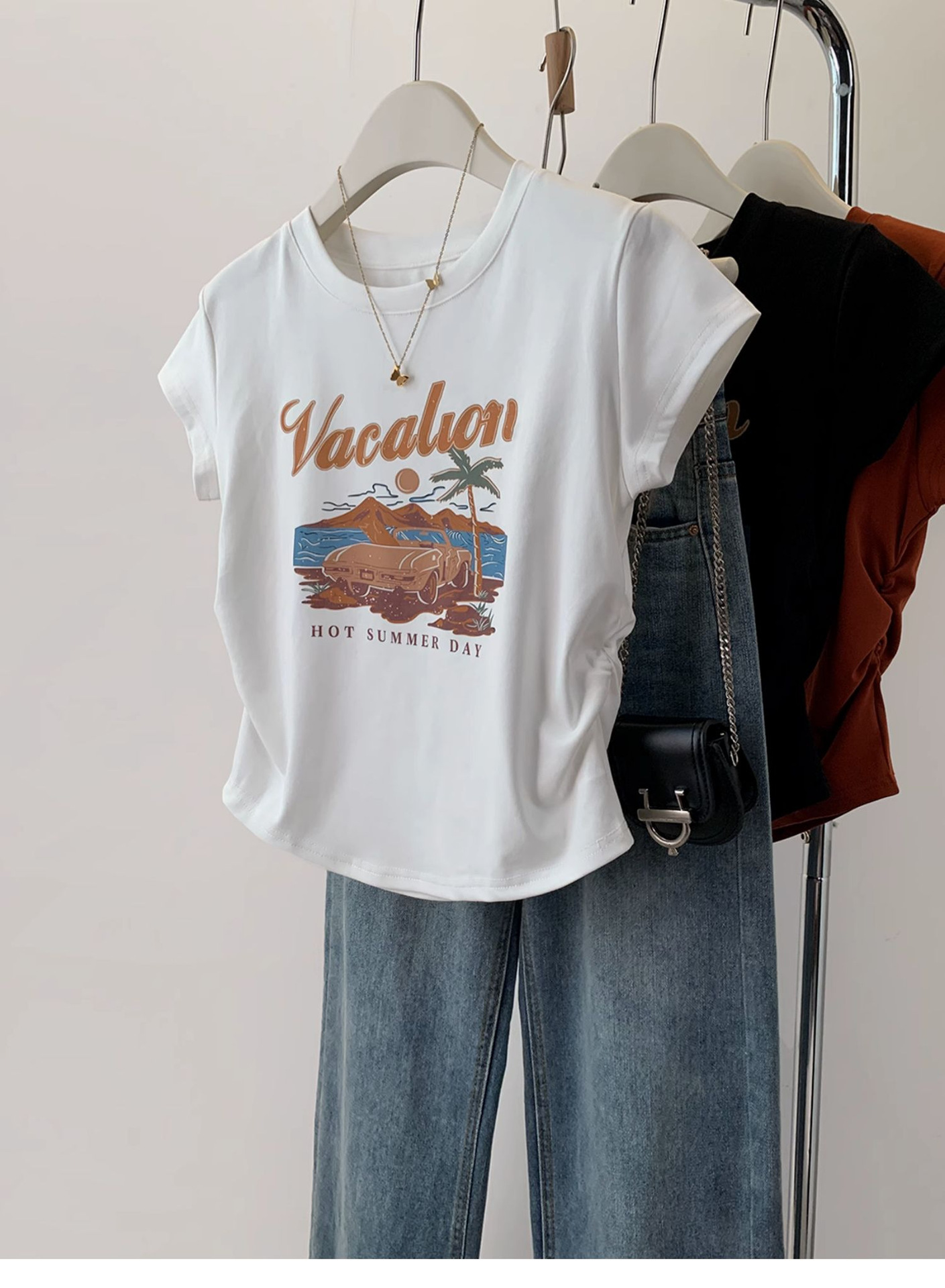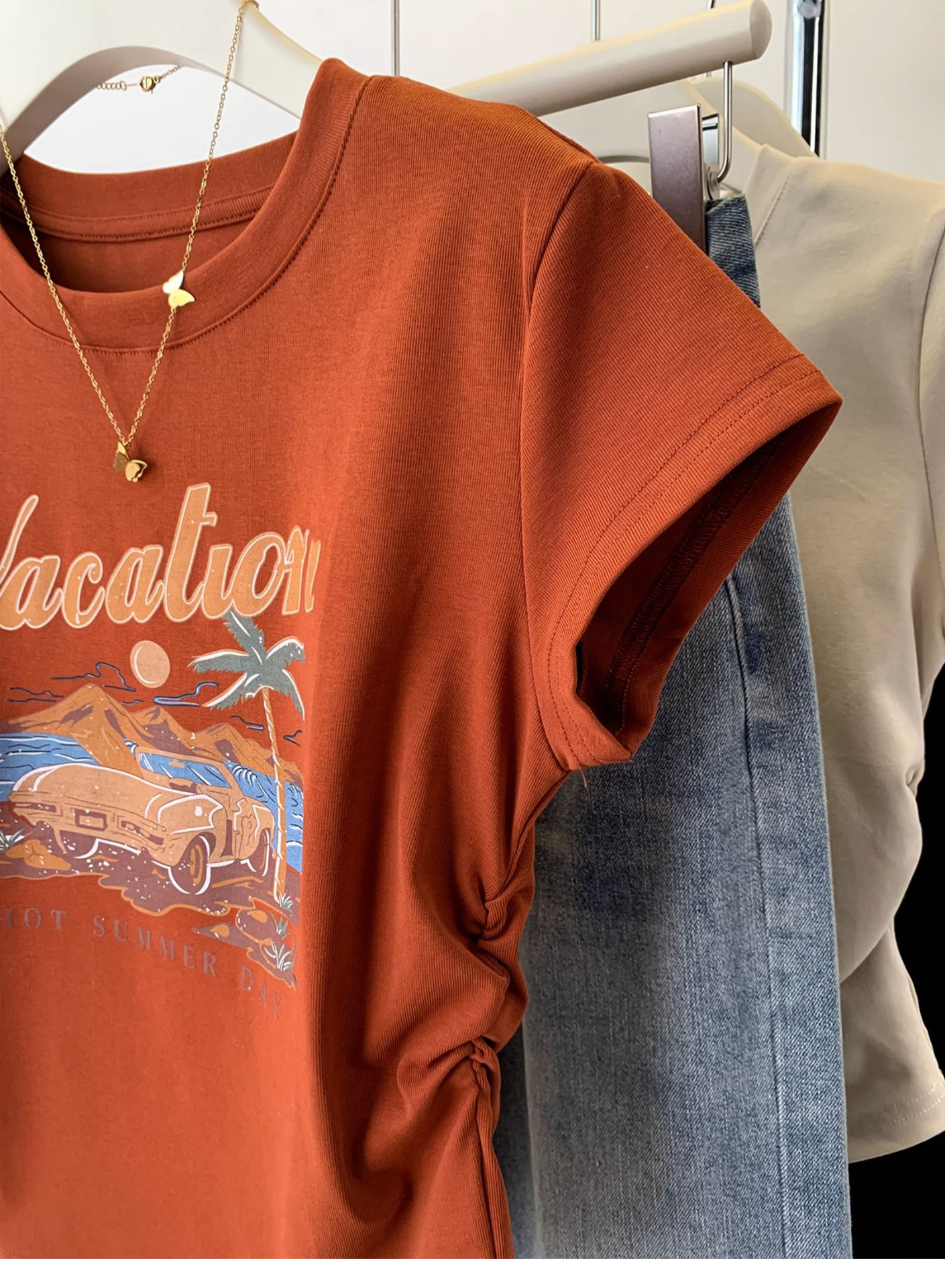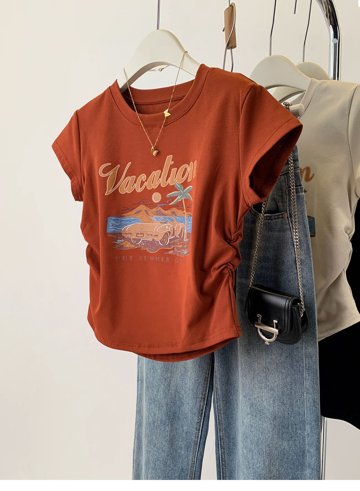 Pure cotton American retro print front shoulder short-sleeved t-shirt women's summer spice slim and thin pleated short top ins