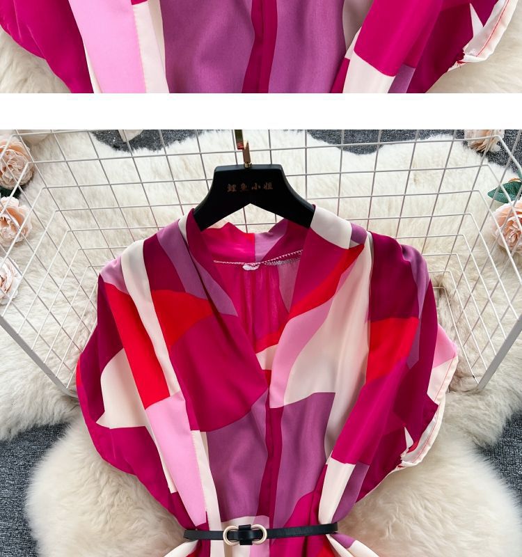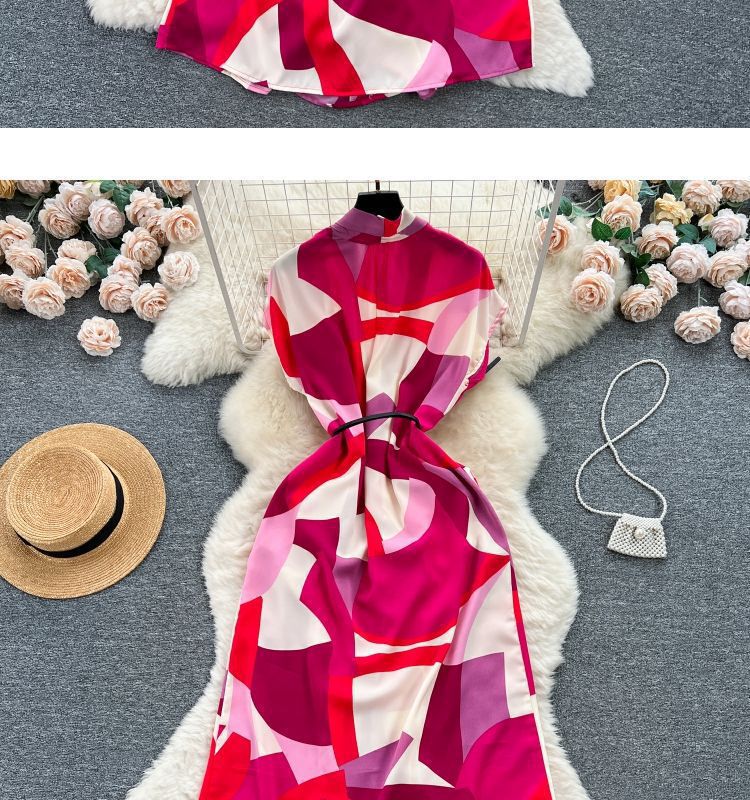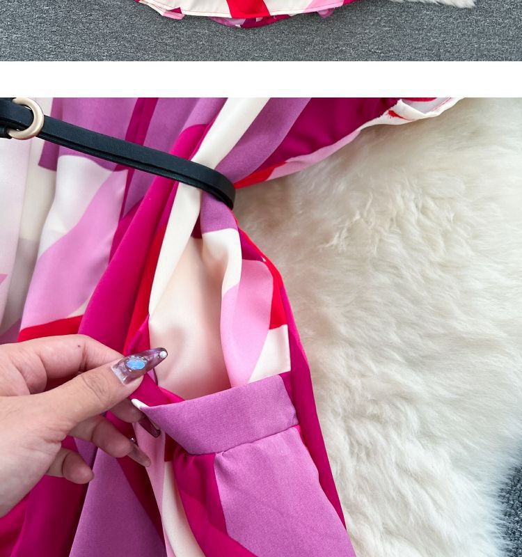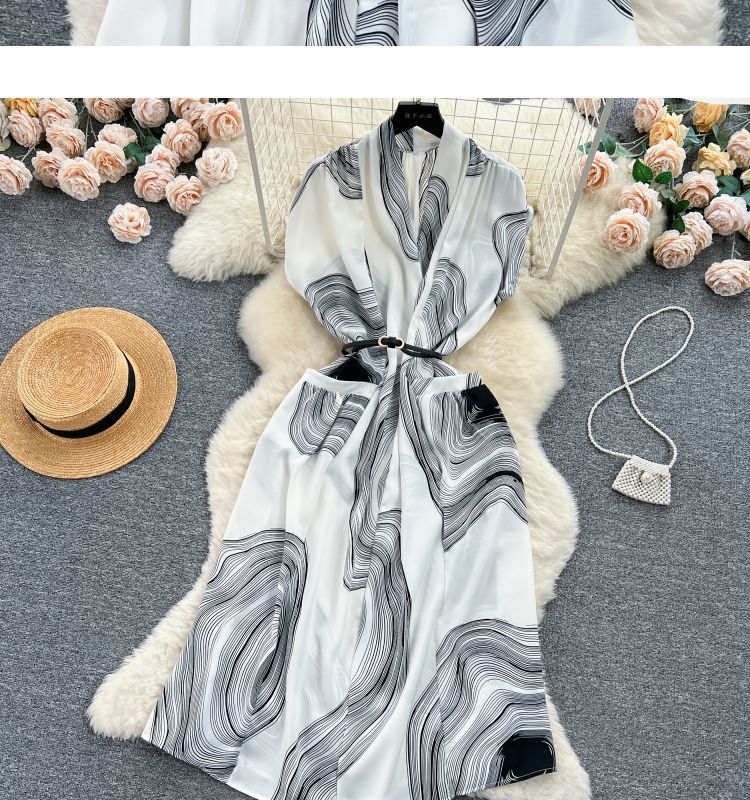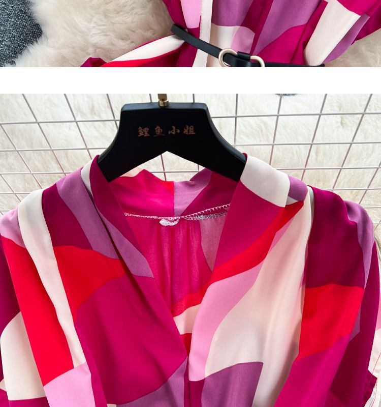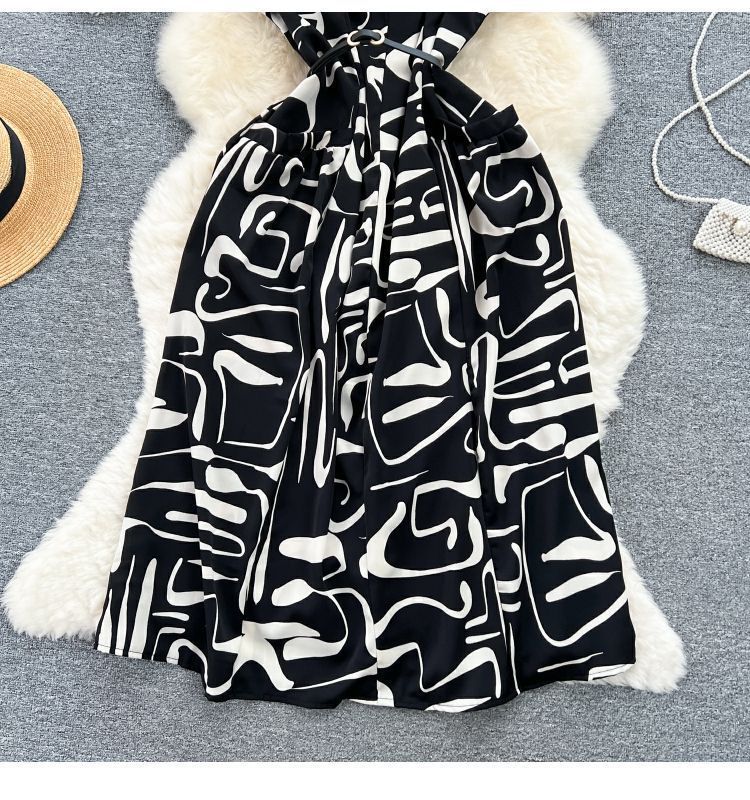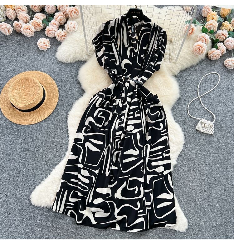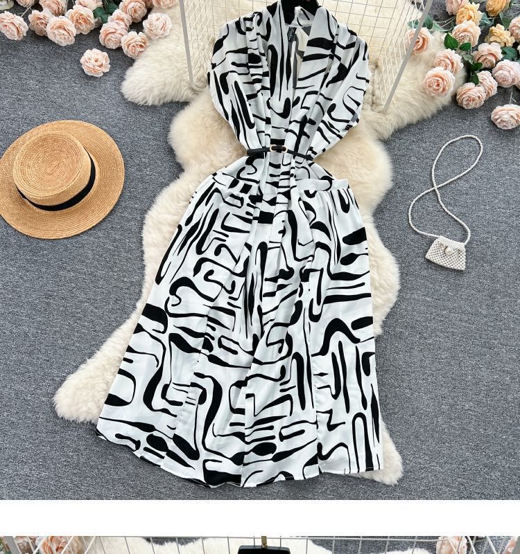 Retro collar print dress women's spring and autumn French space-up waist loose and thin medium and long shirt skirt