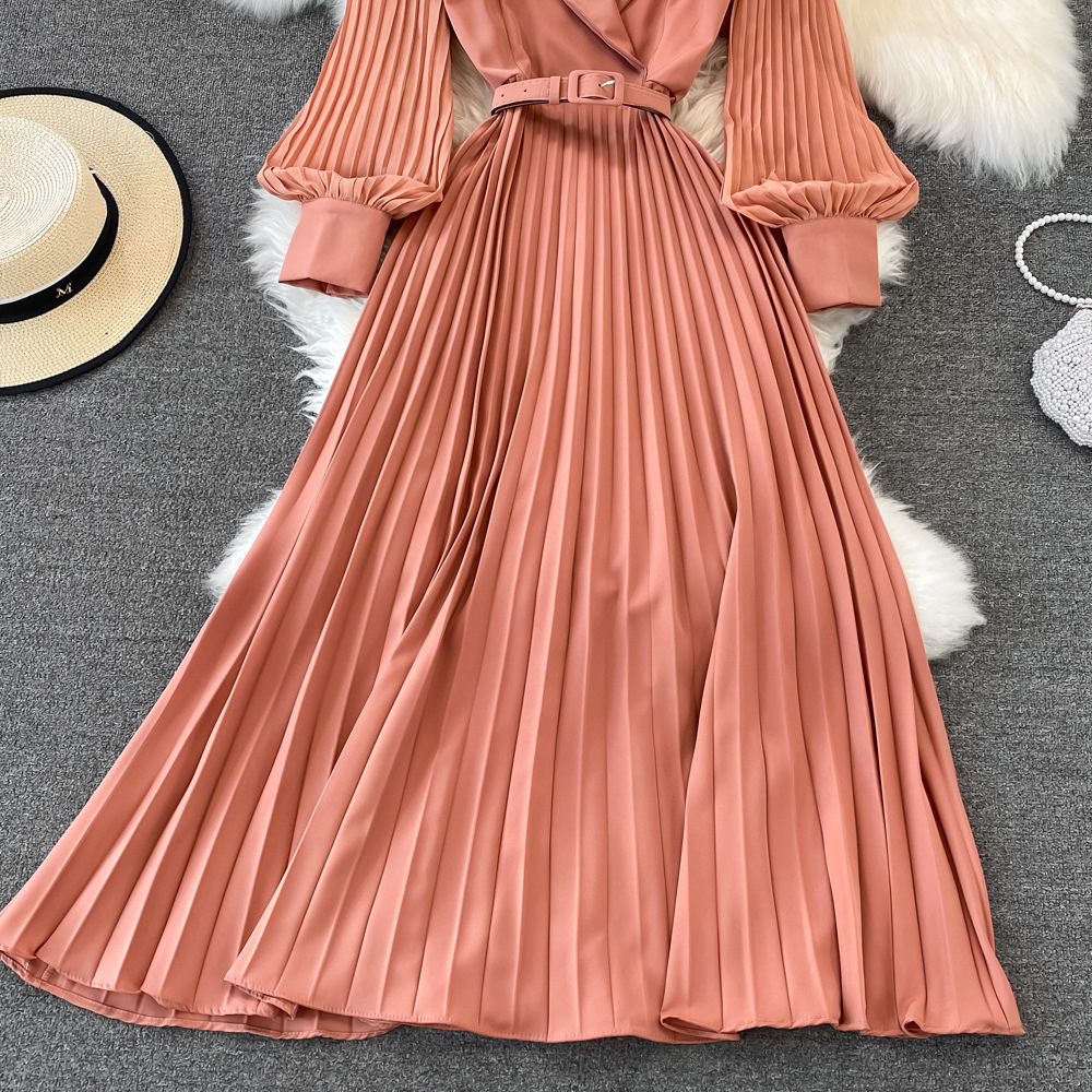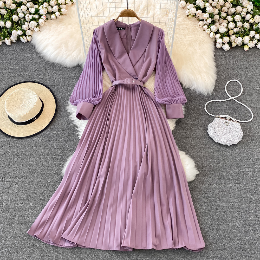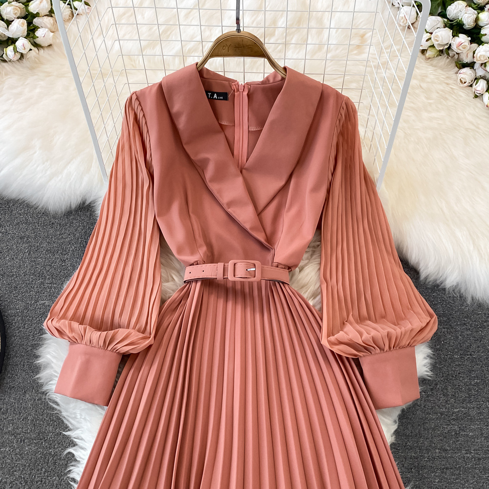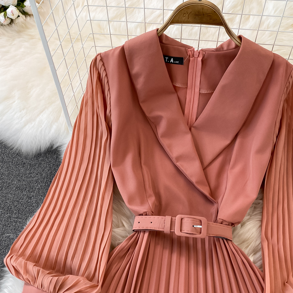 Spring French retro suit collar strap waist thin pleated dress commuter fashion high waist big swing dress