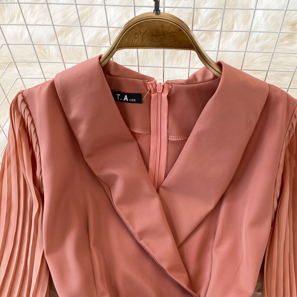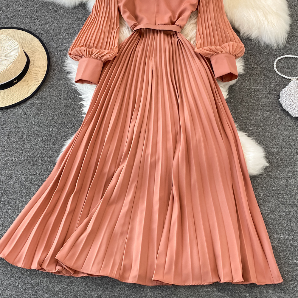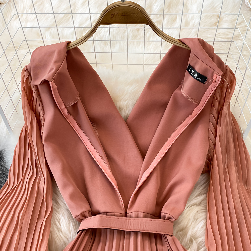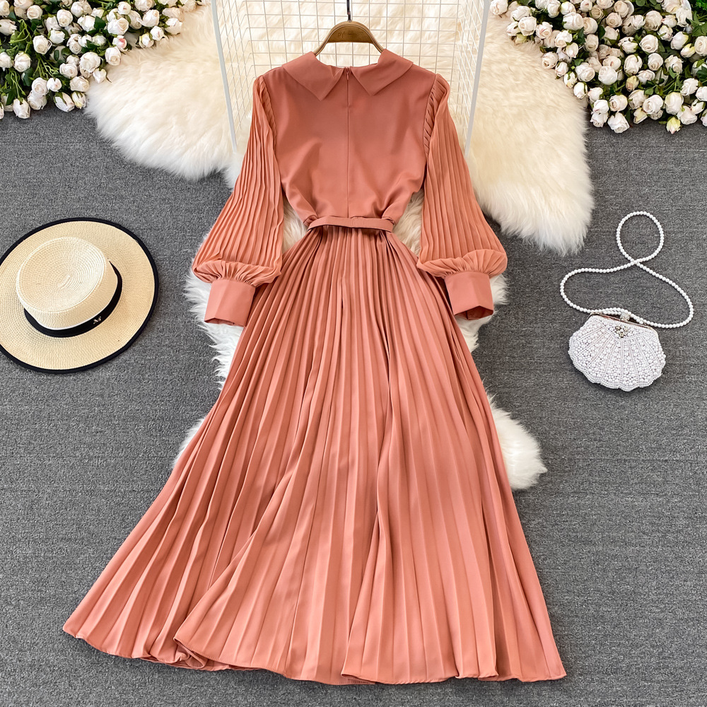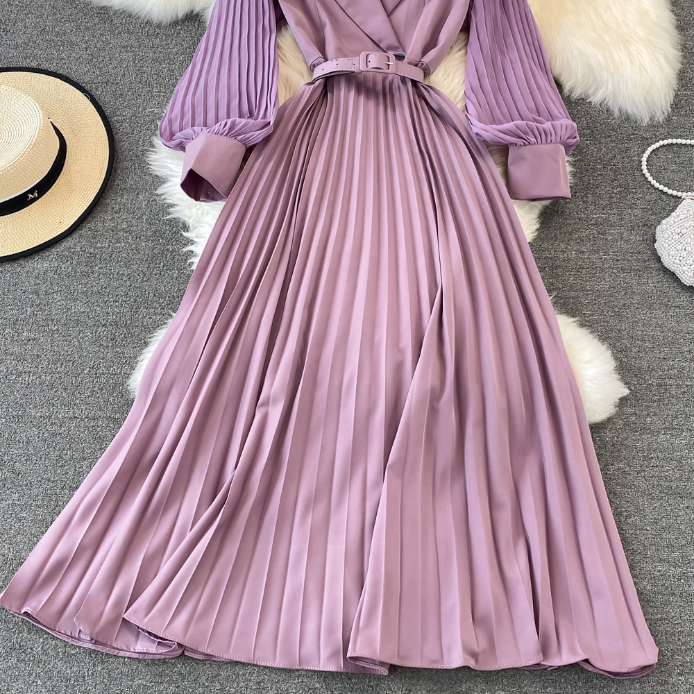 Spring French retro suit collar strap waist thin pleated dress commuter fashion high waist big swing dress