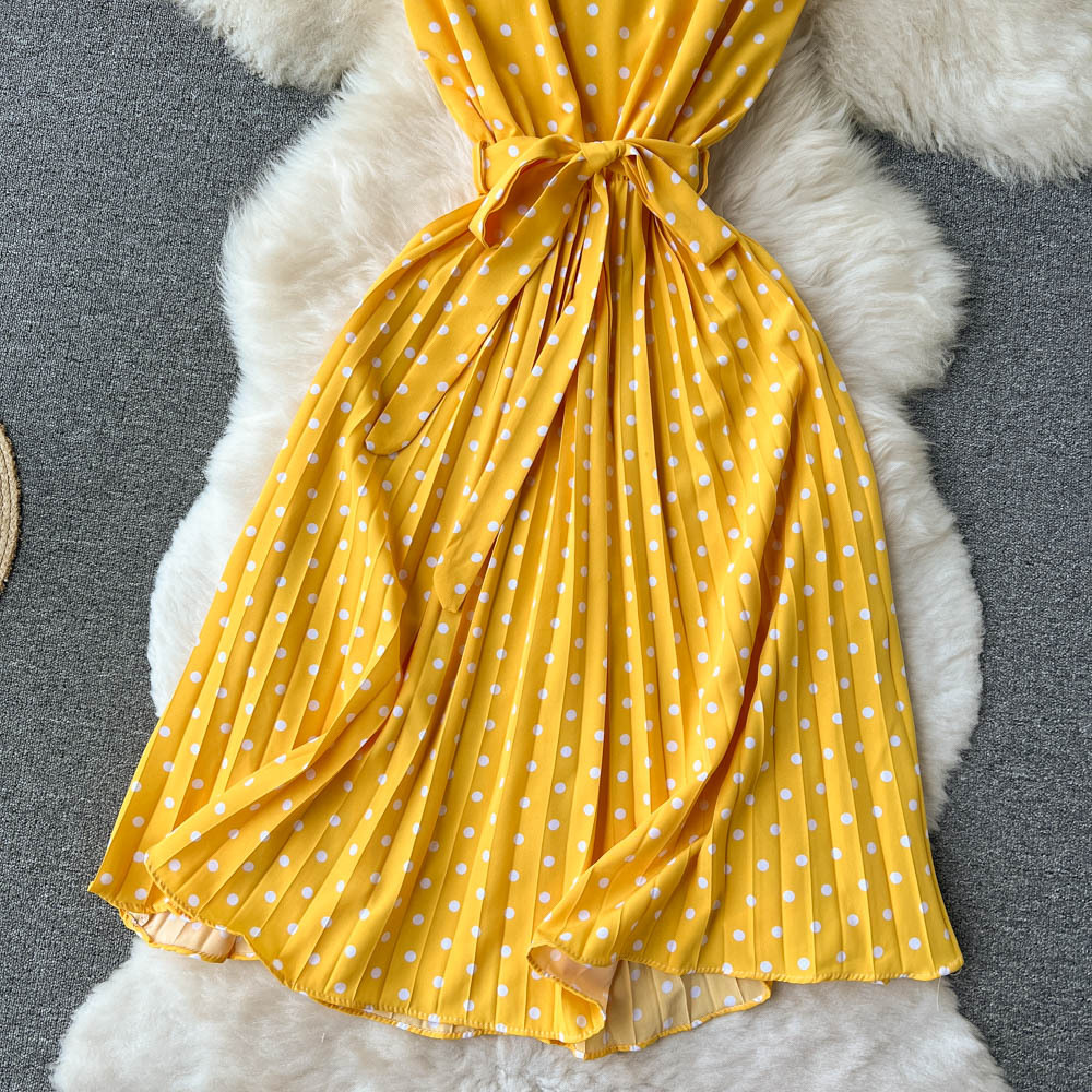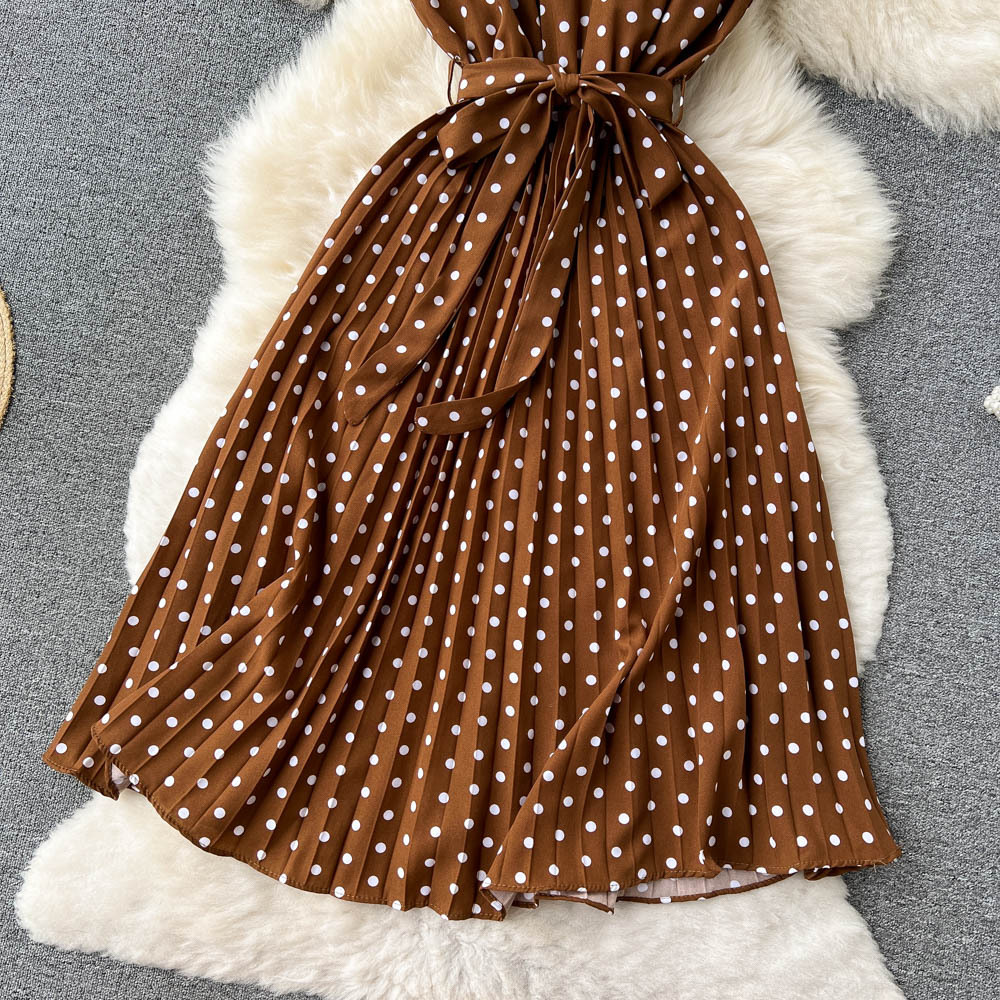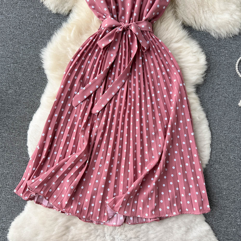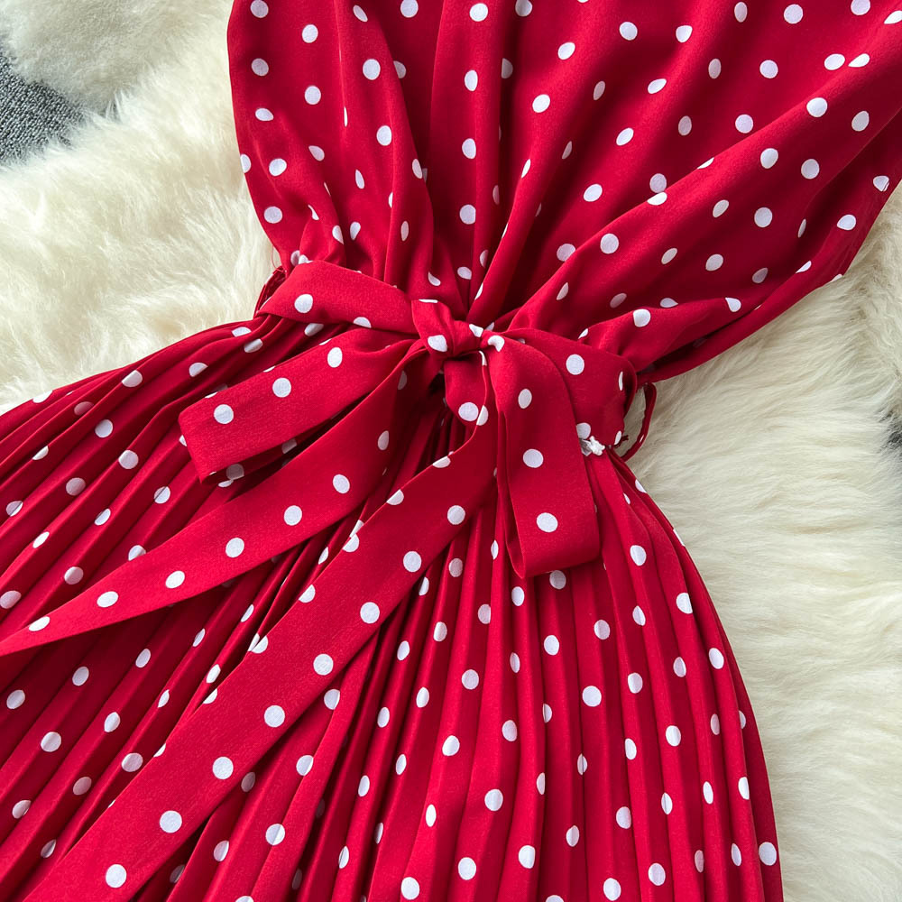 Summer gentle wind coffee break French retro polka dot dress strapped waist thin sweet pleated pendulum skirt