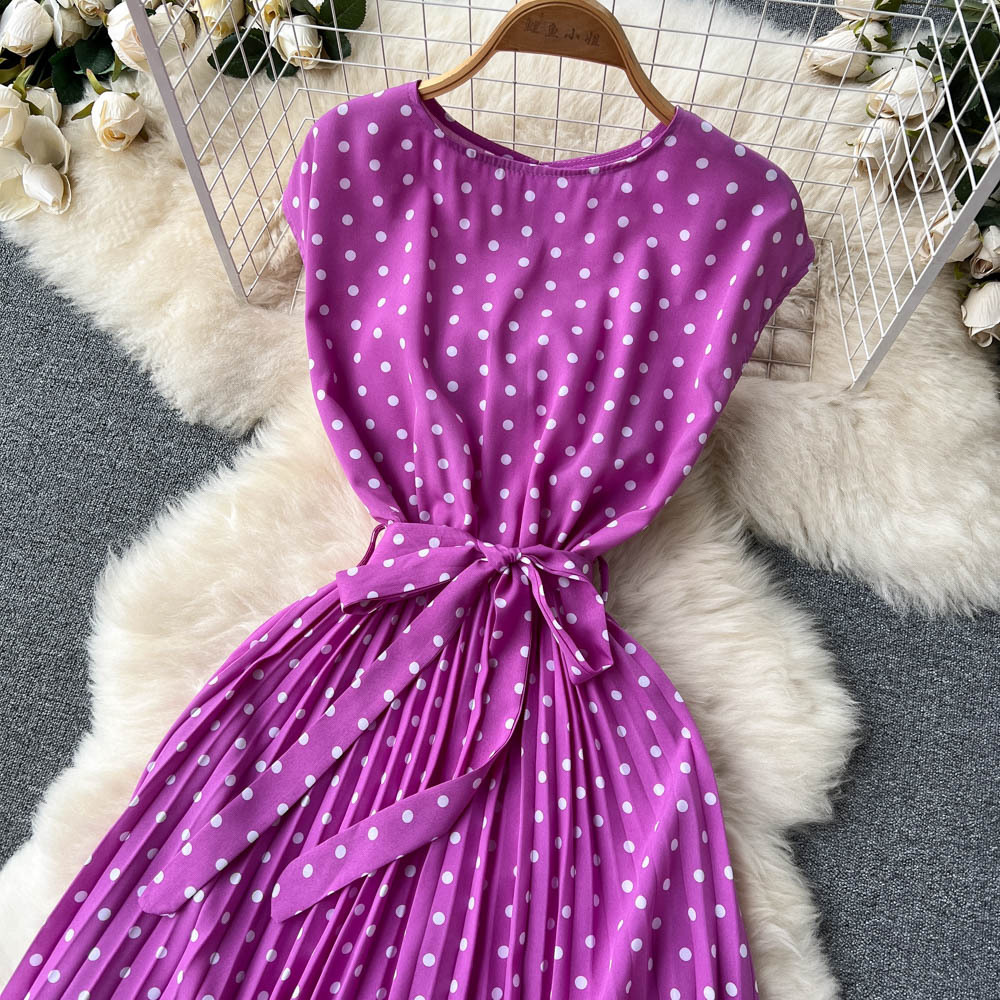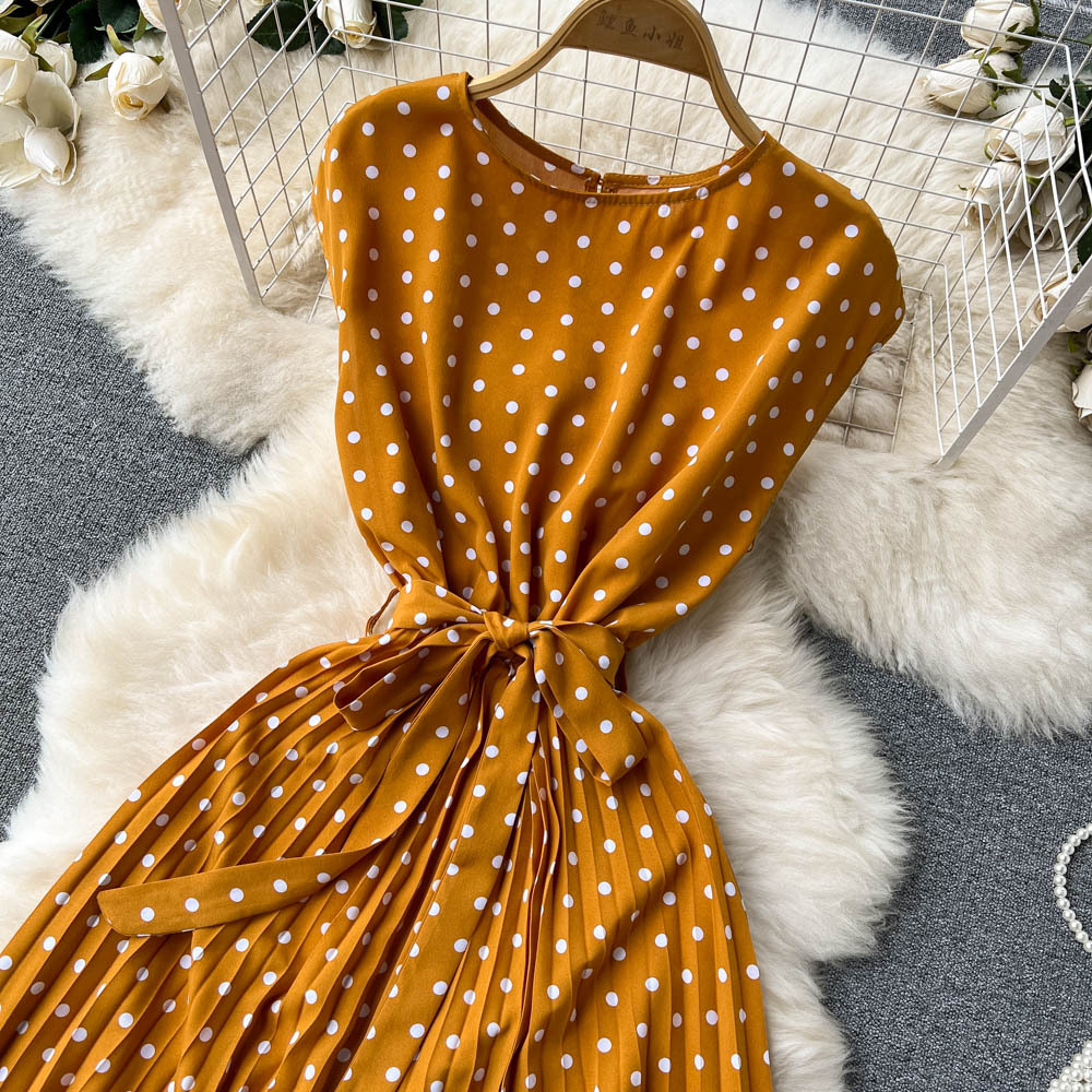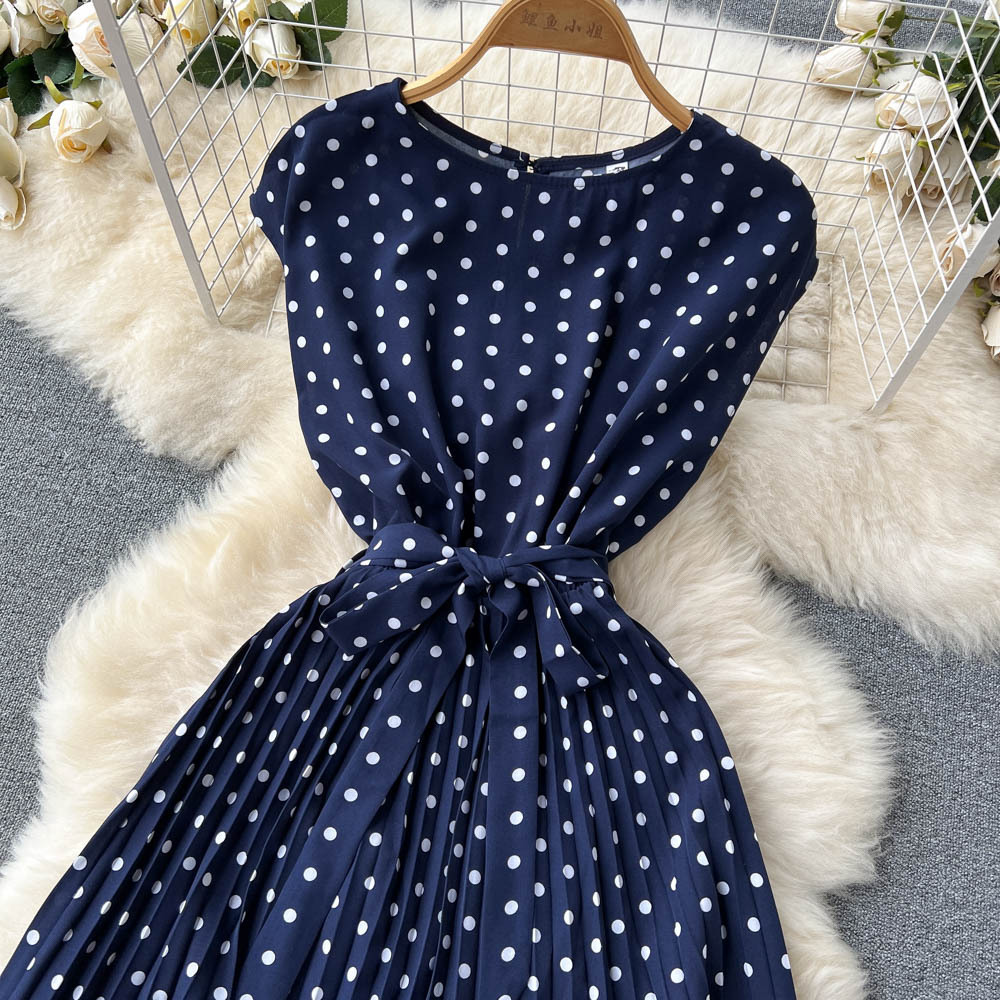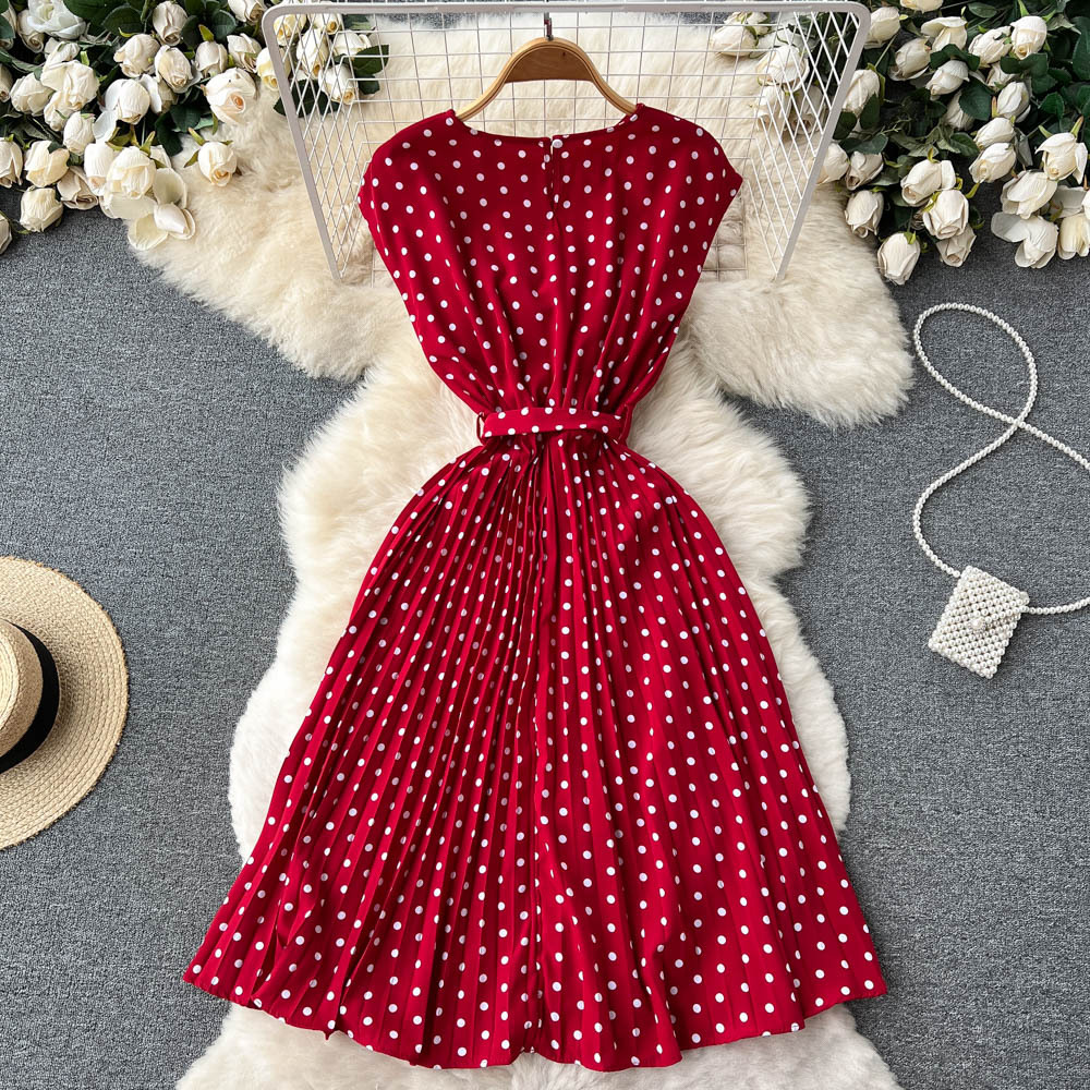 Summer gentle wind coffee break French retro polka dot dress strapped waist thin sweet pleated pendulum skirt