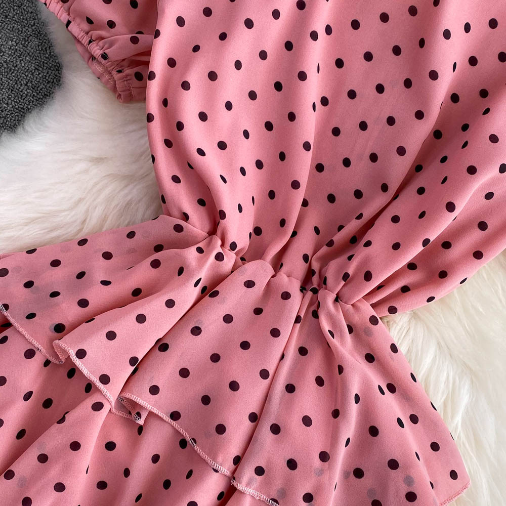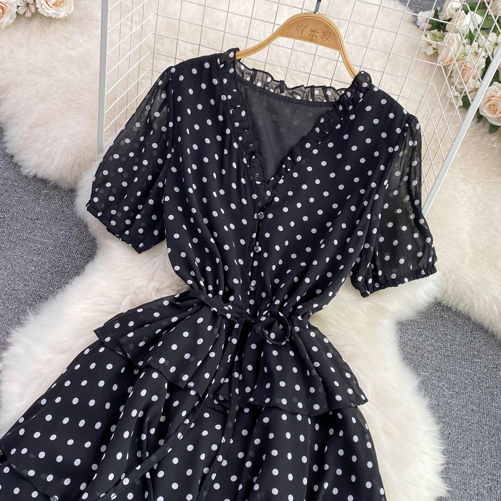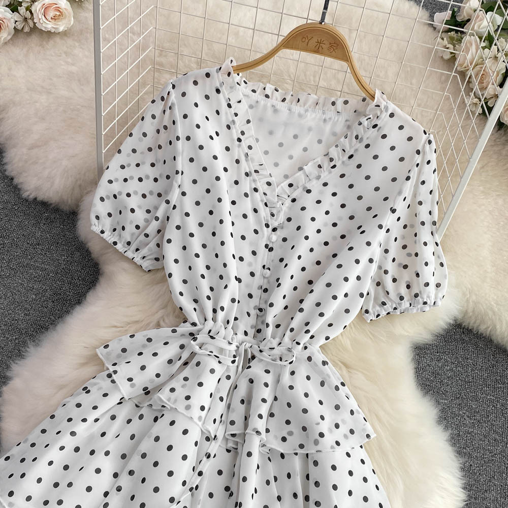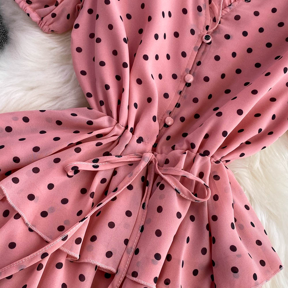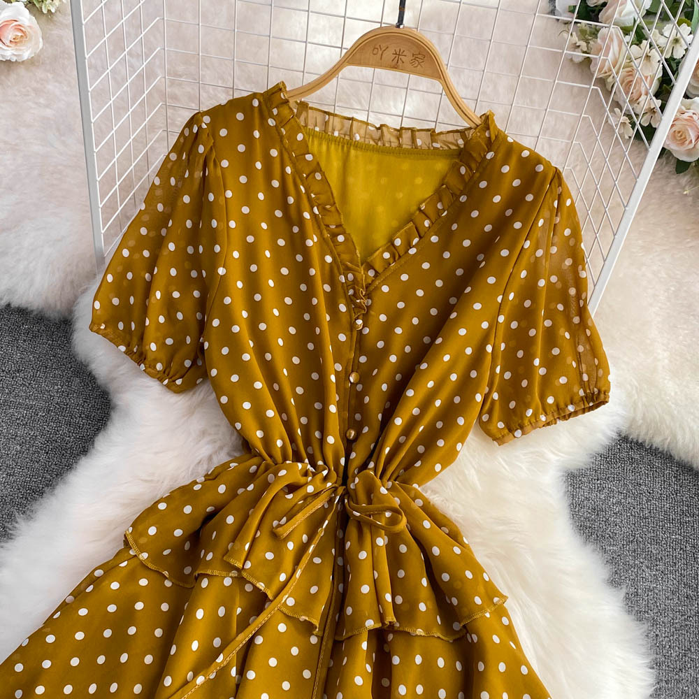 Summer gentle wind collar bubble short sleeves waist thin polka dot dress elegant temperament big pendulum long skirt