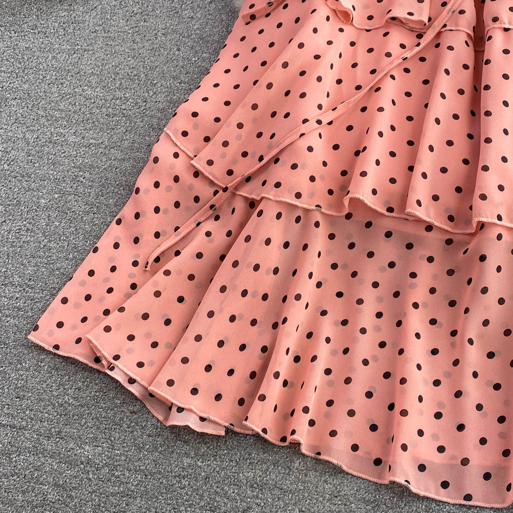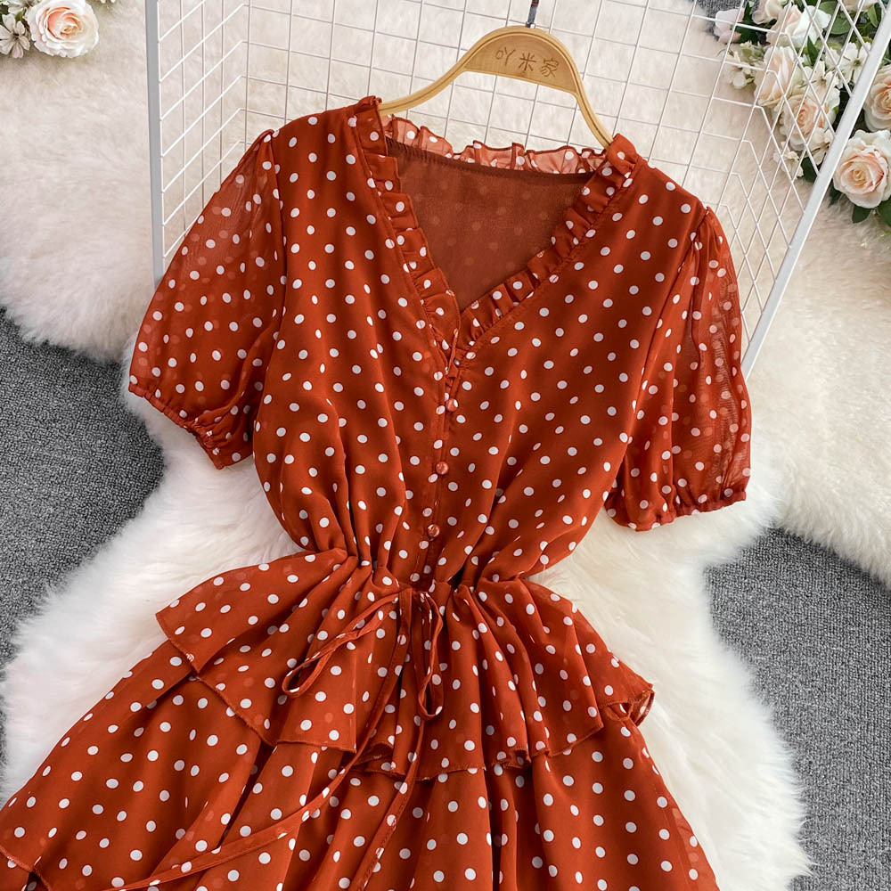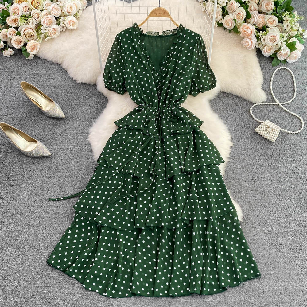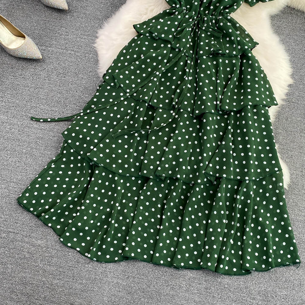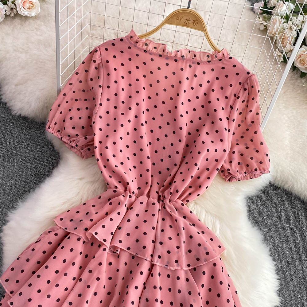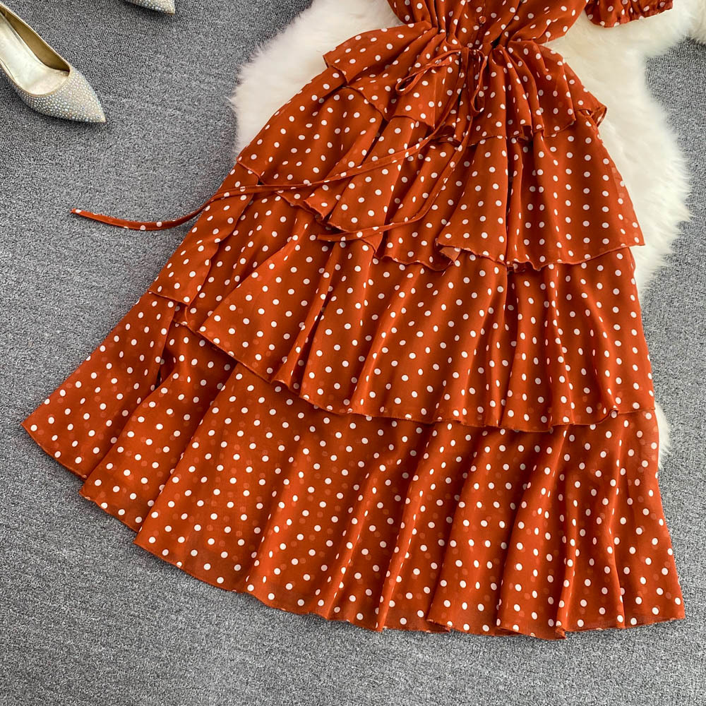 Summer gentle wind collar bubble short sleeves waist thin polka dot dress elegant temperament big pendulum long skirt