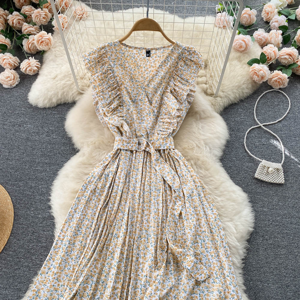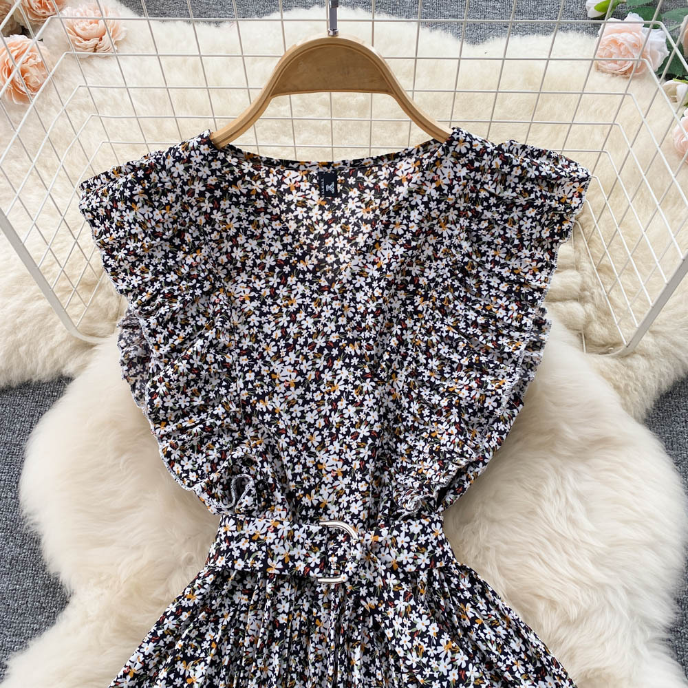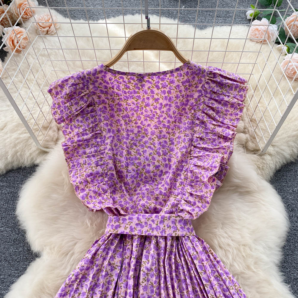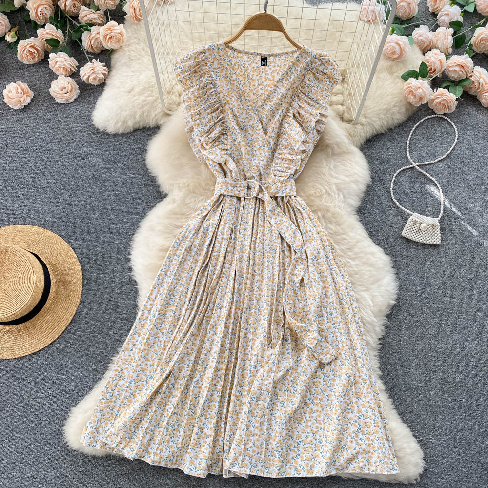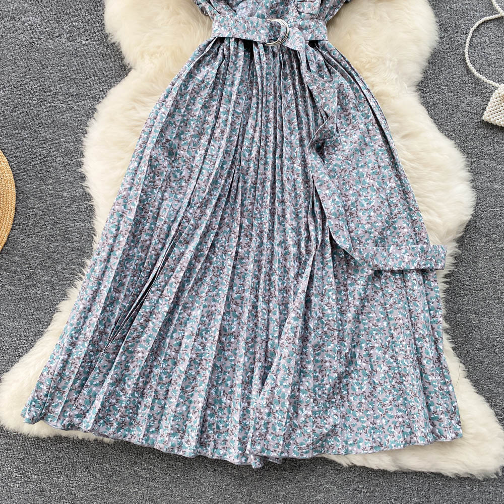 Summer Korean fungus edge girl retro sweet small fresh floral dress space-up waist pleated skirt