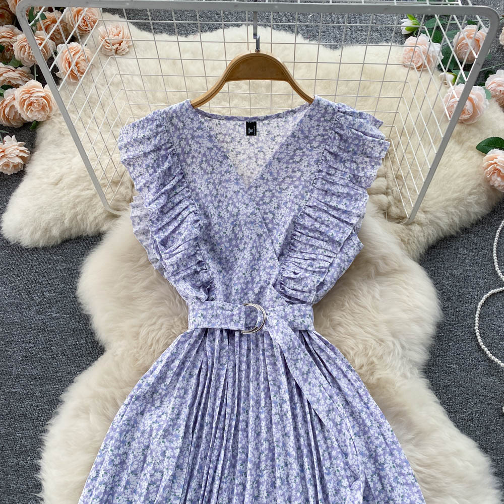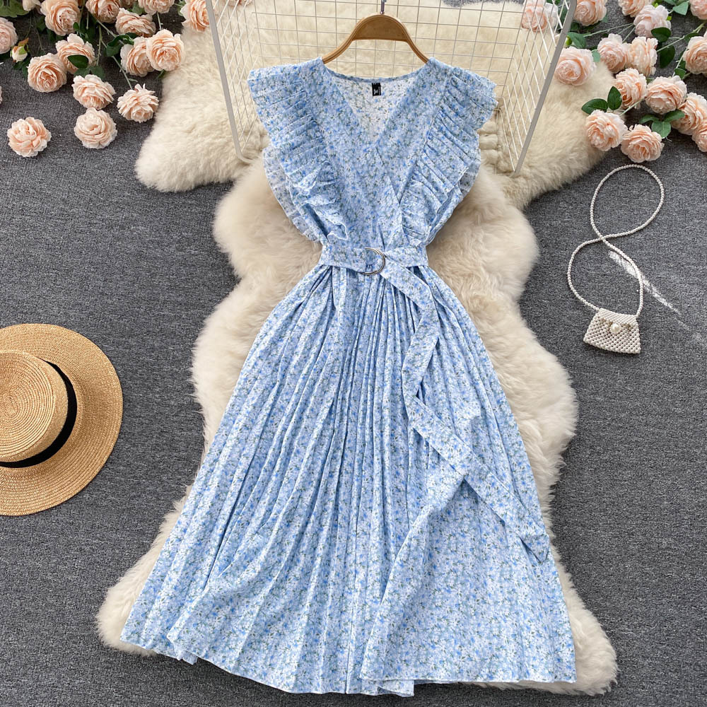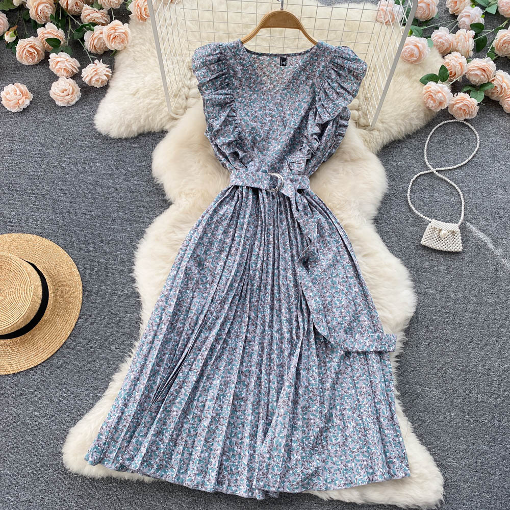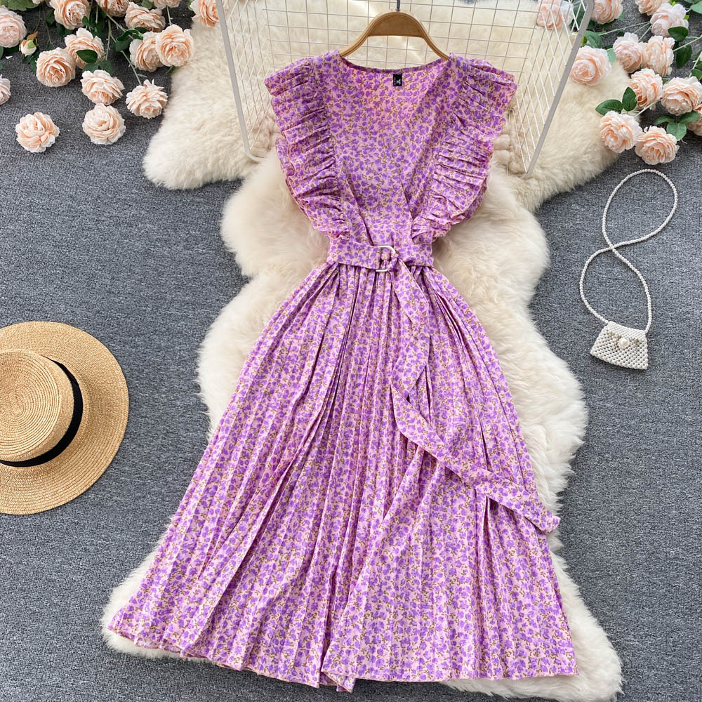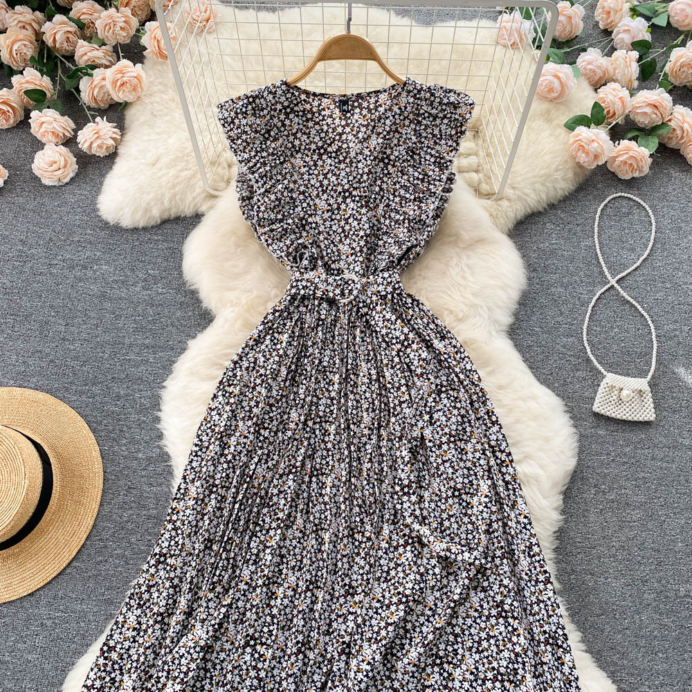 Summer Korean fungus edge girl retro sweet small fresh floral dress space-up waist pleated skirt