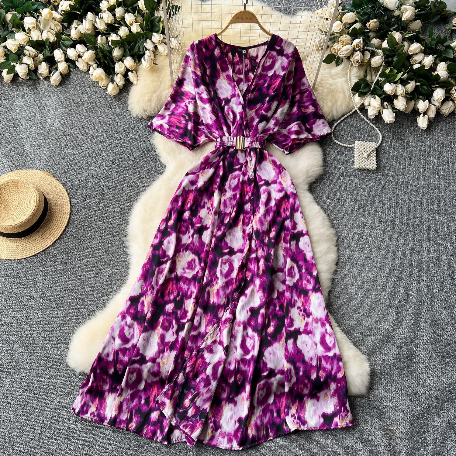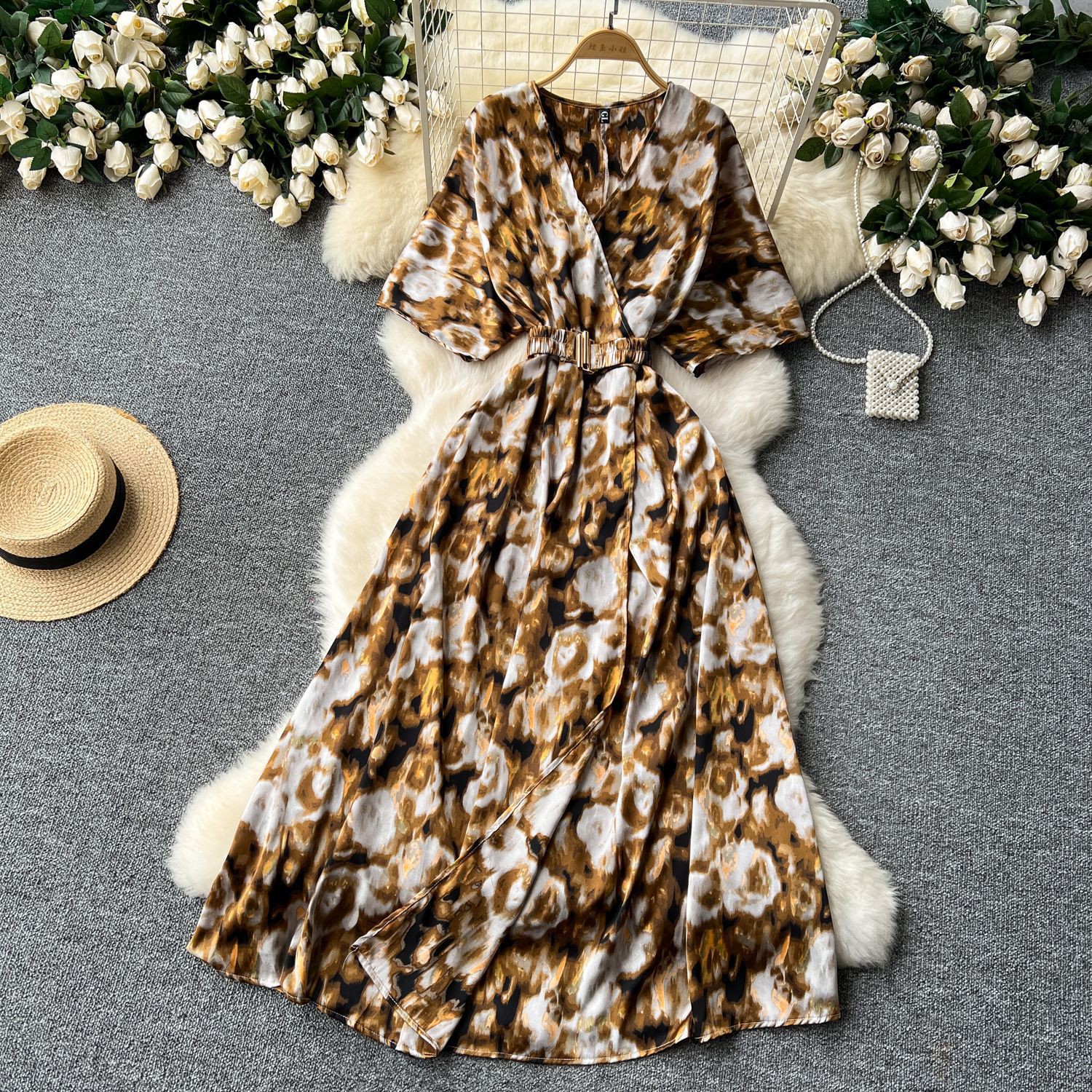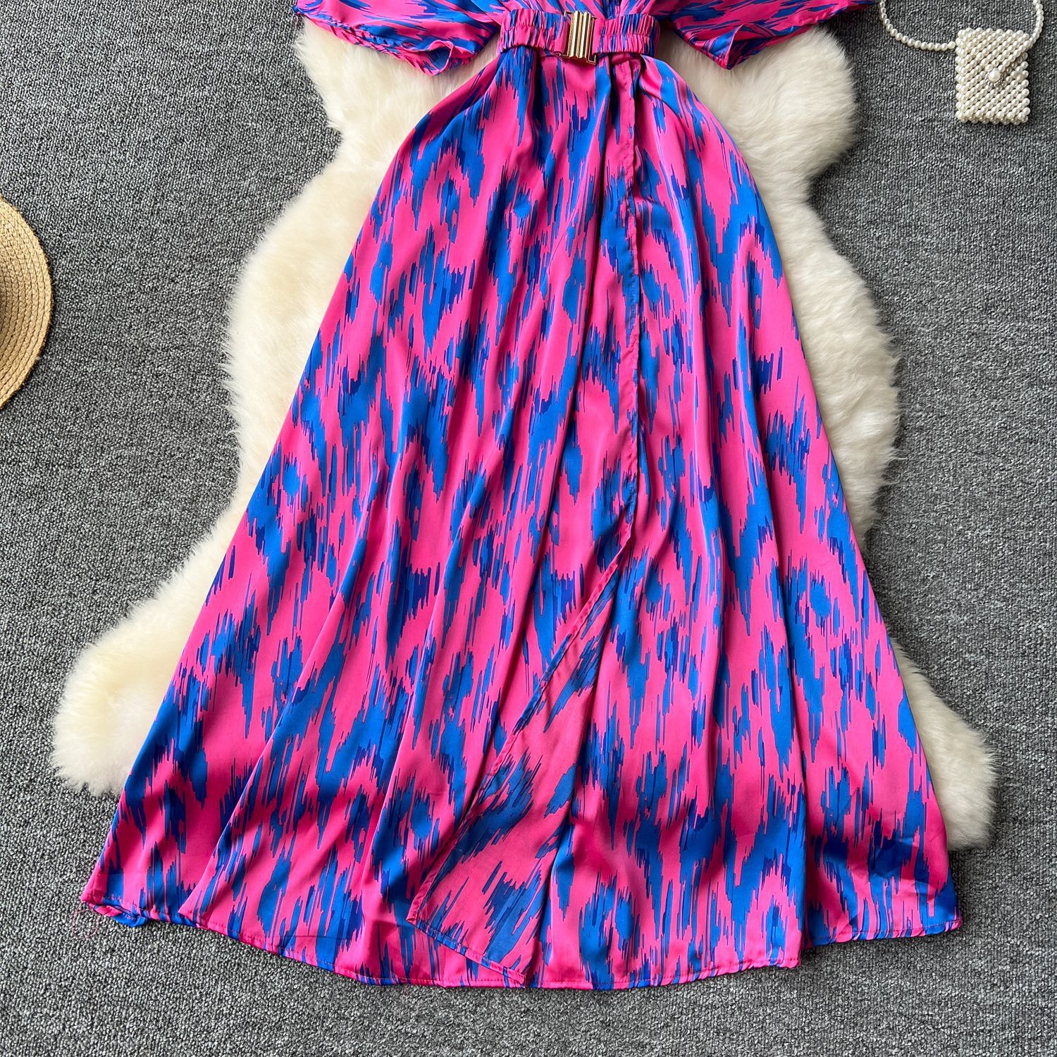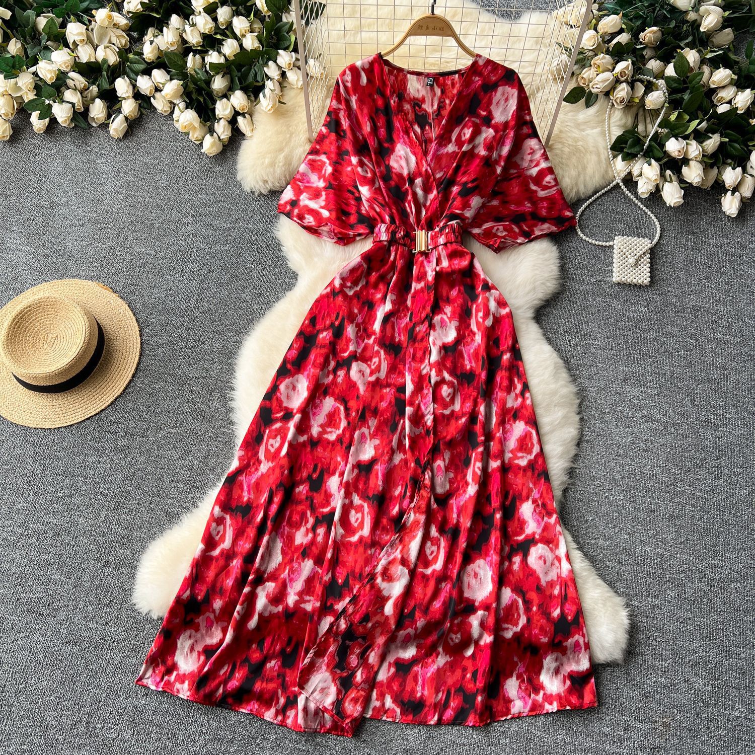 Summer new European and American style niche light luxury retro collar waist thin big swing split printing dress
