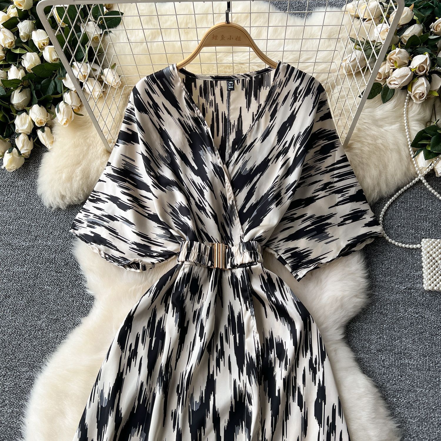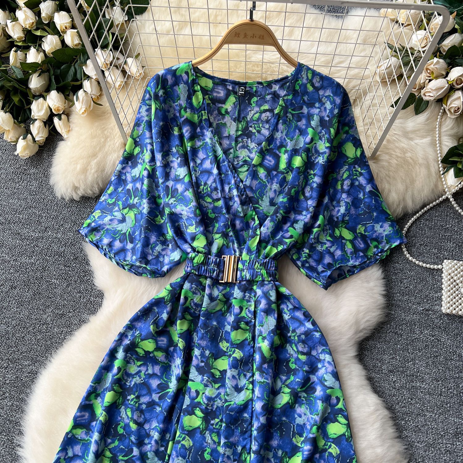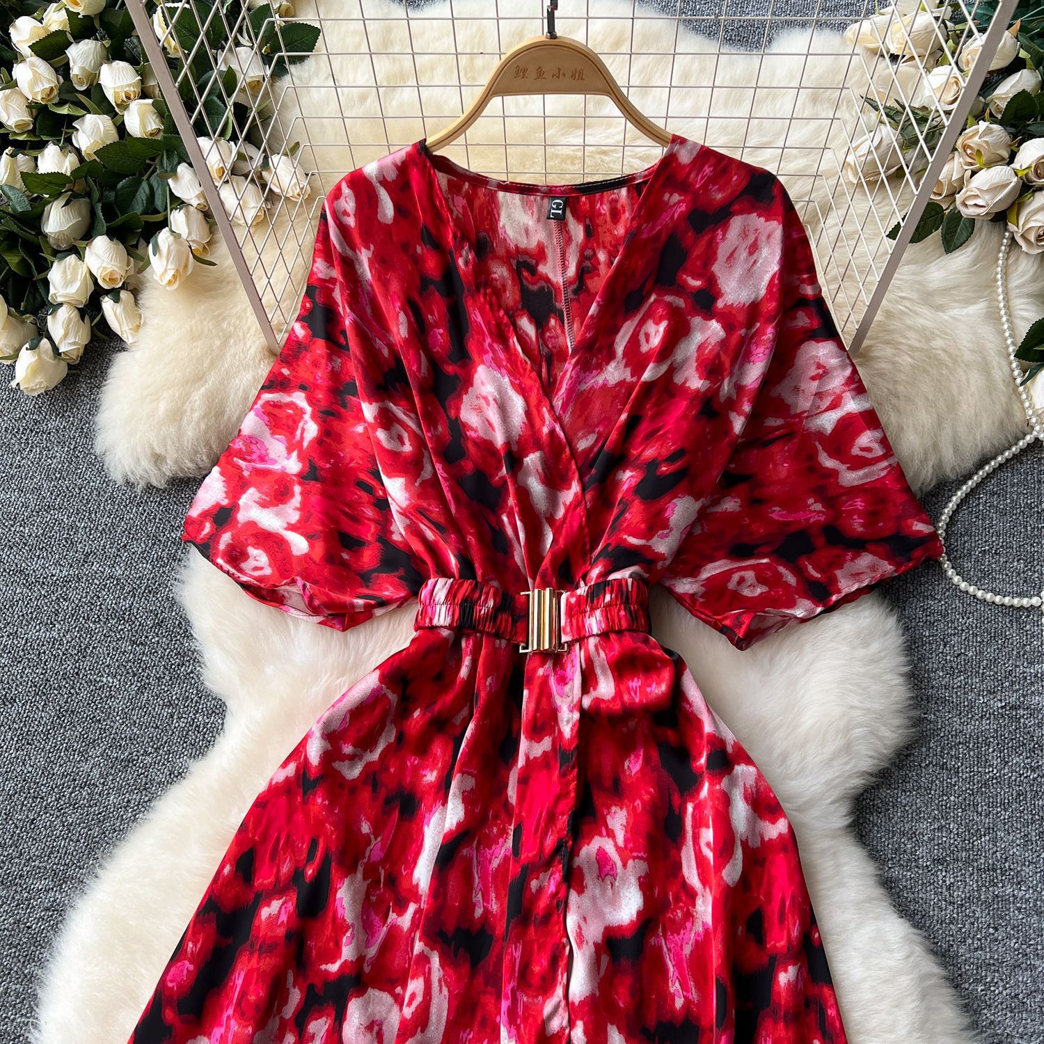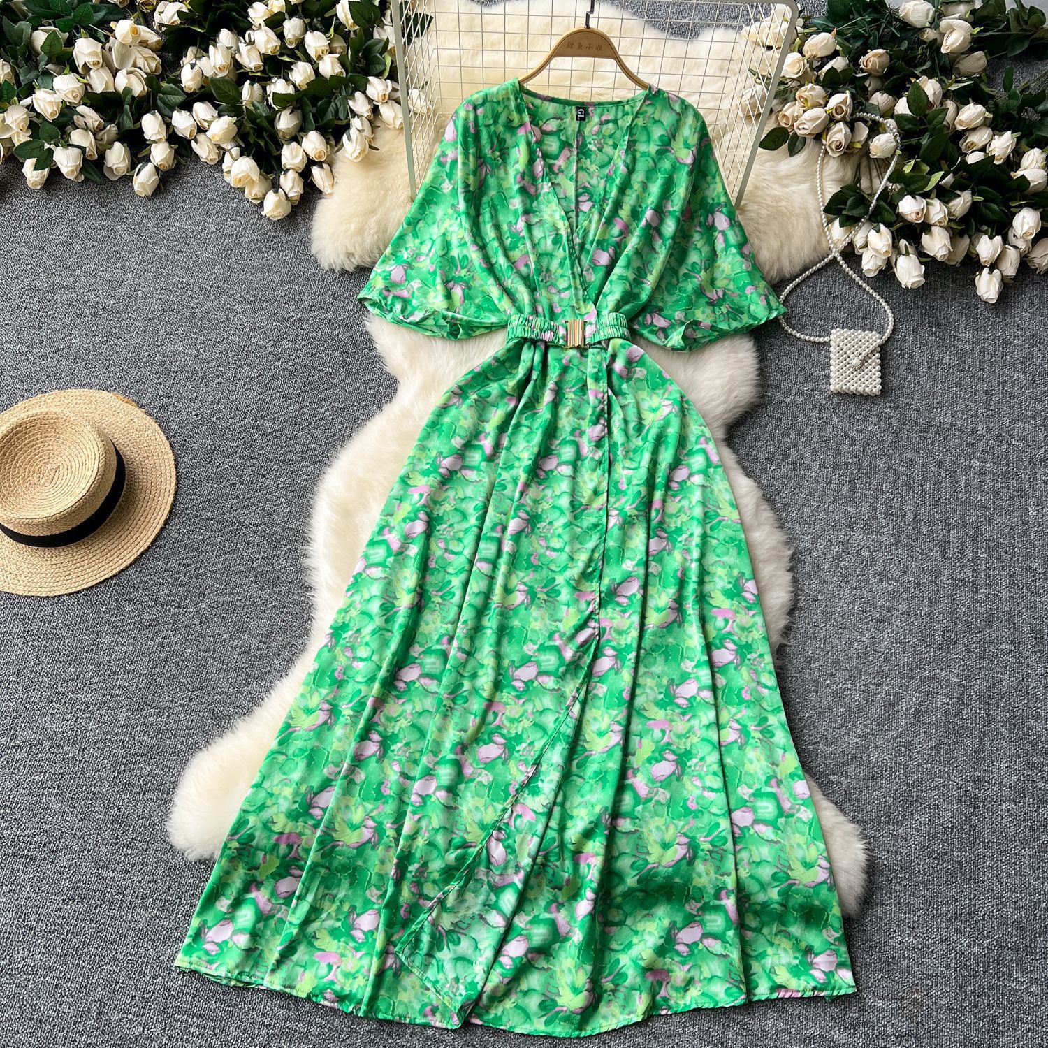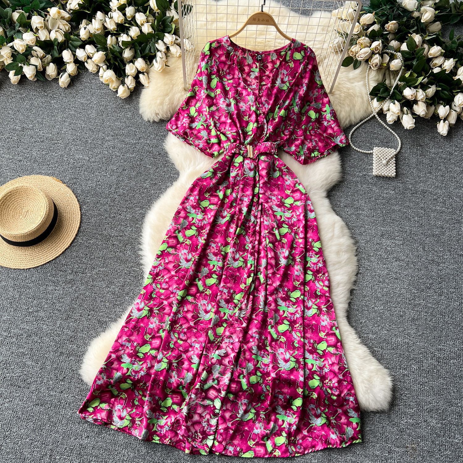 Summer new European and American style niche light luxury retro collar waist thin big swing split printing dress
