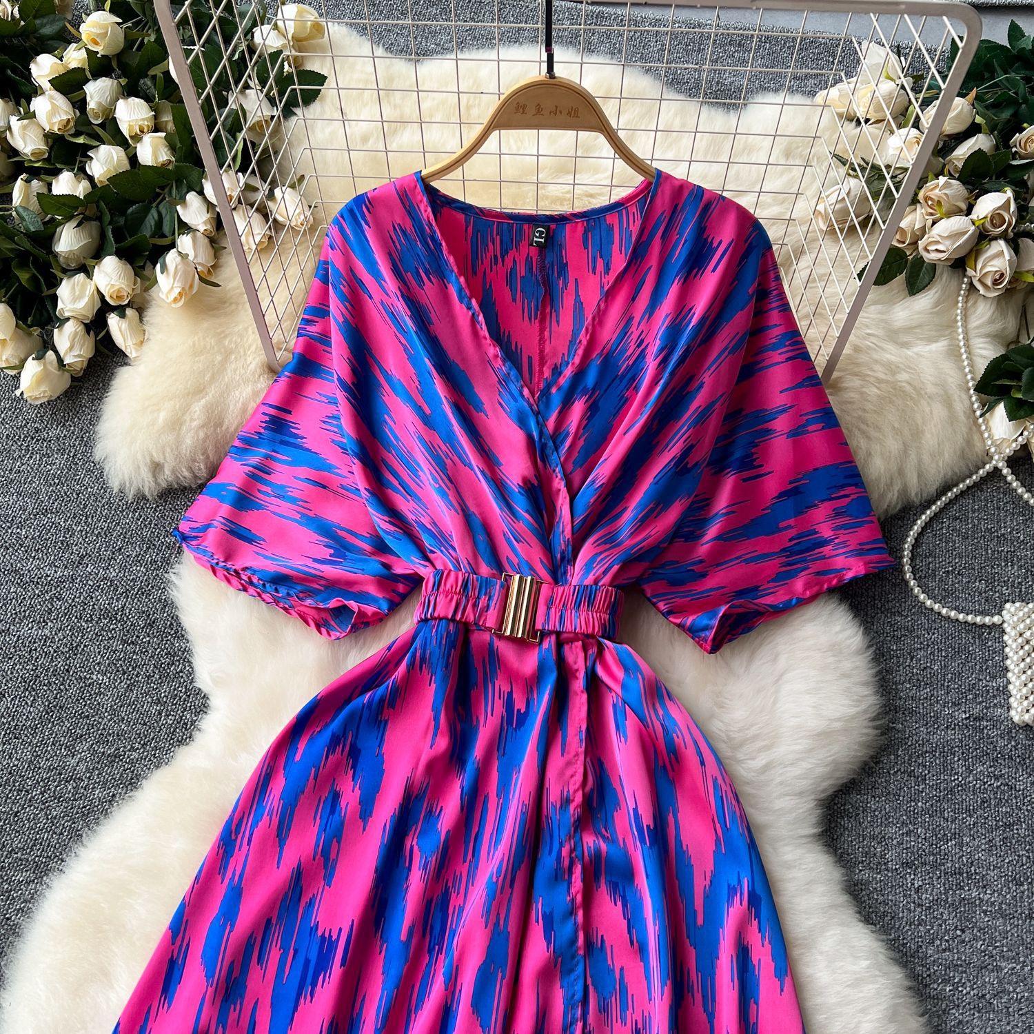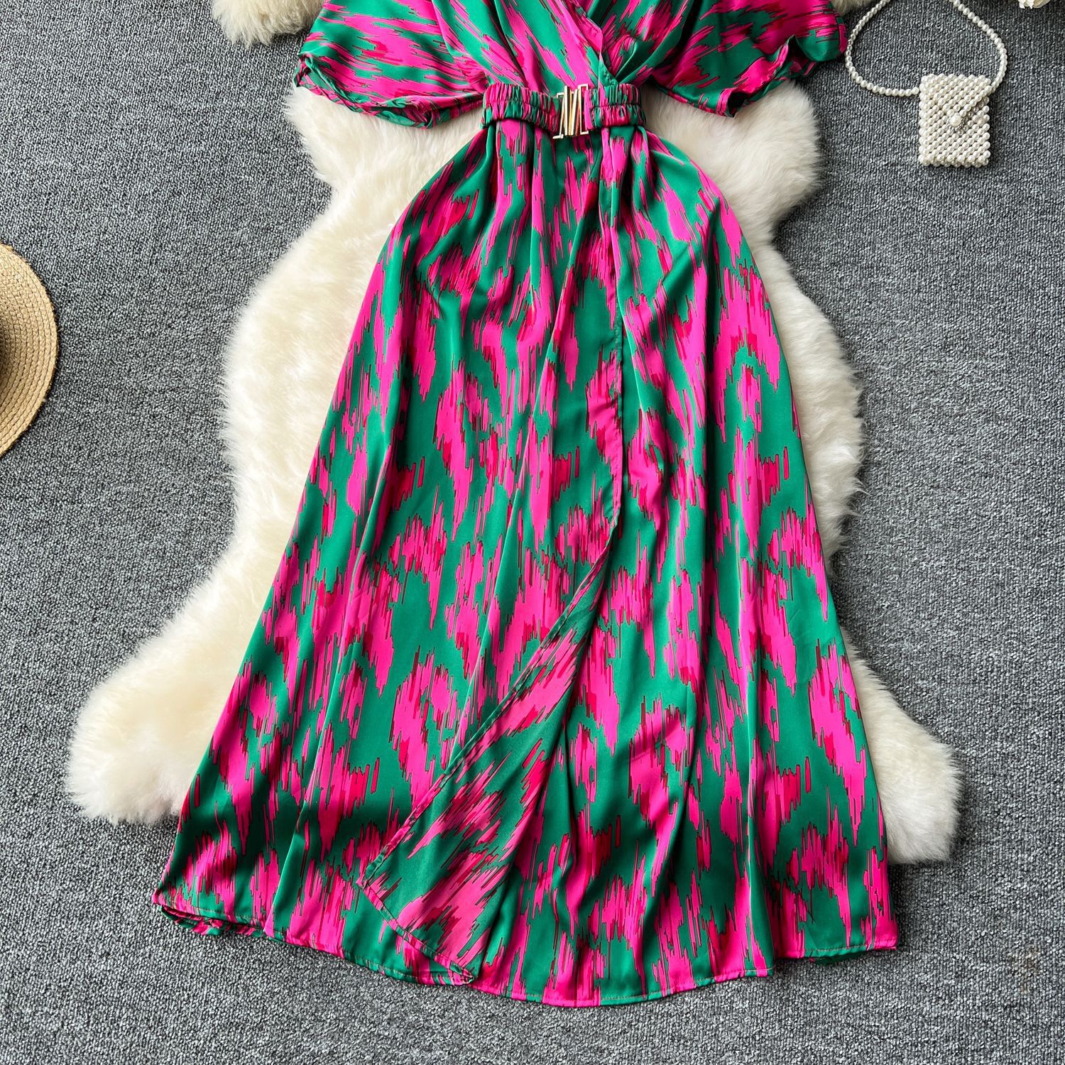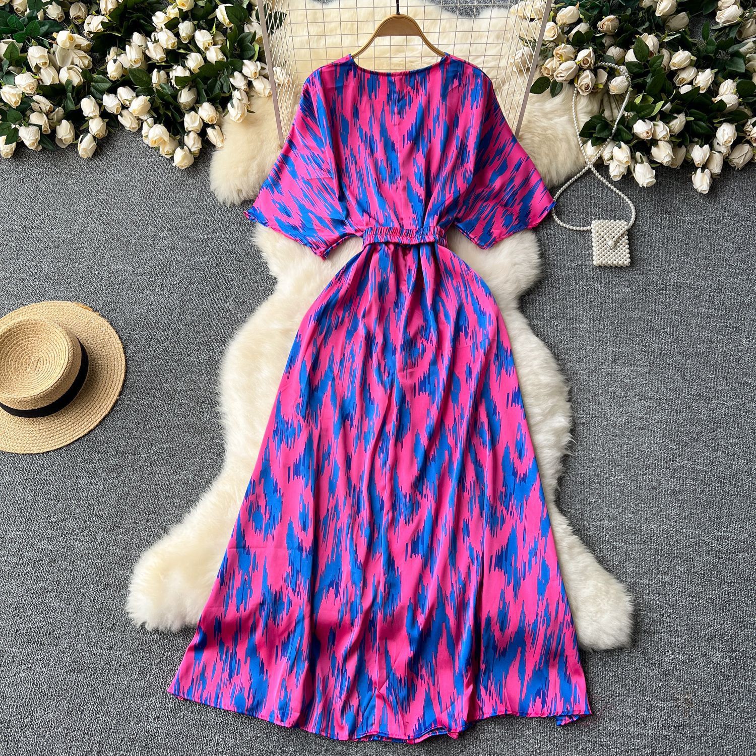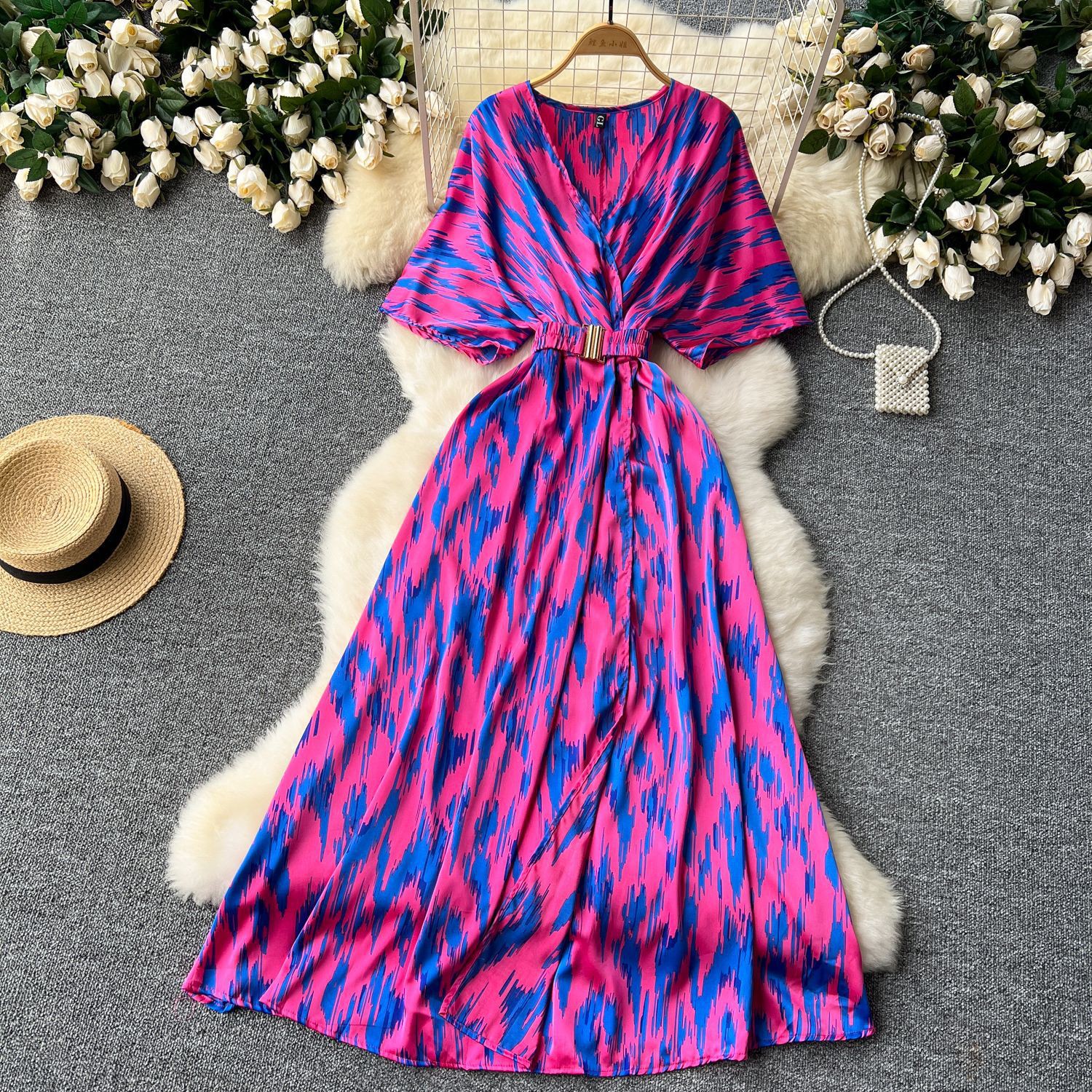 Summer new European and American style niche light luxury retro collar waist thin big swing split printing dress