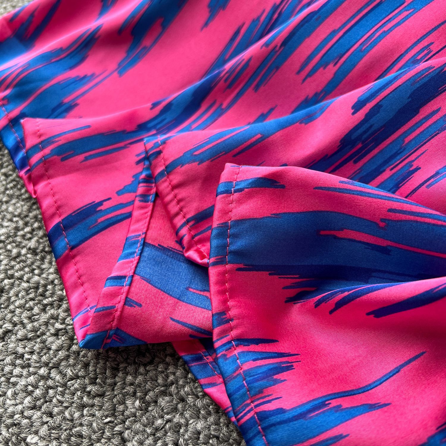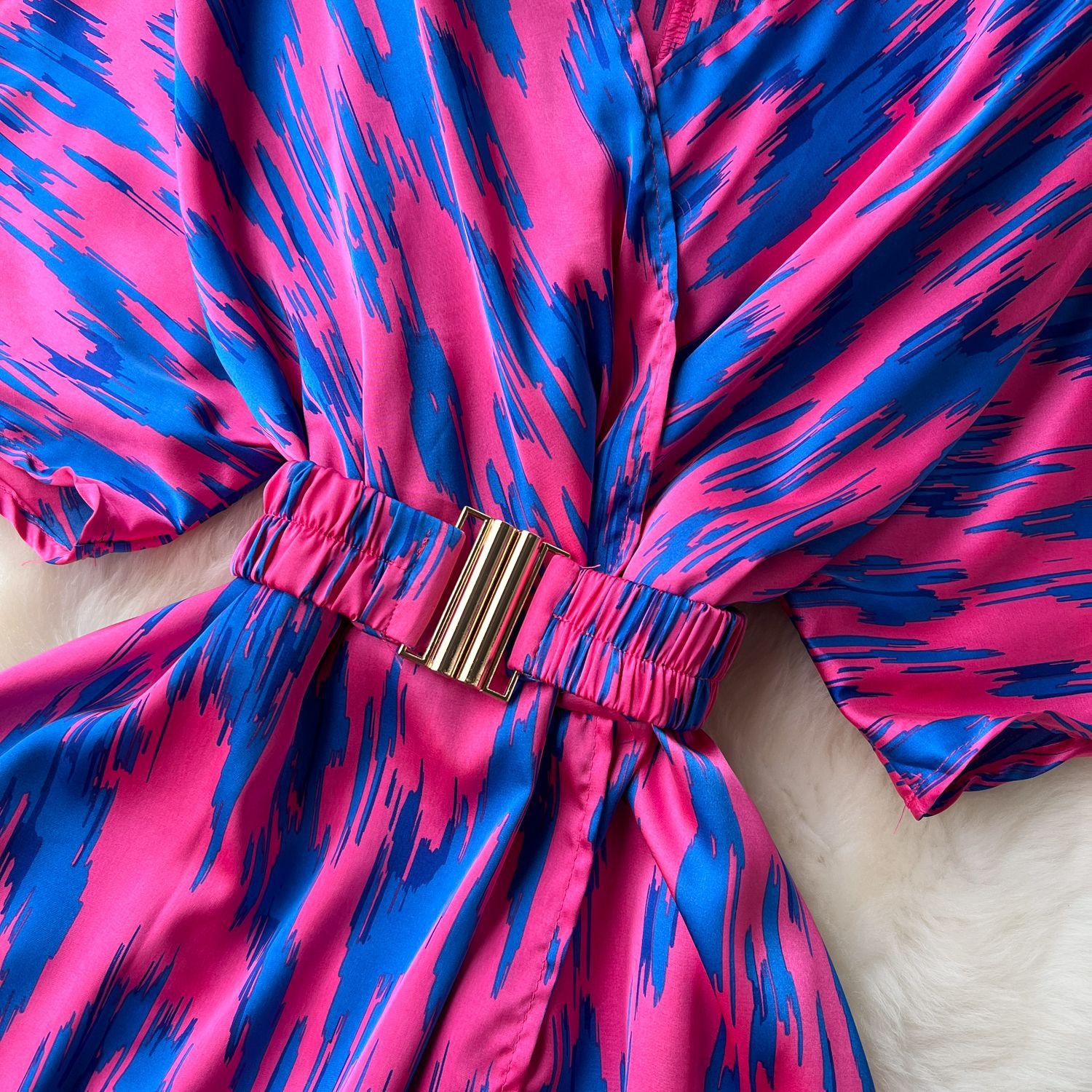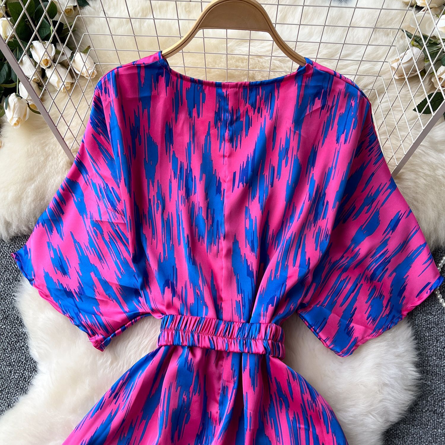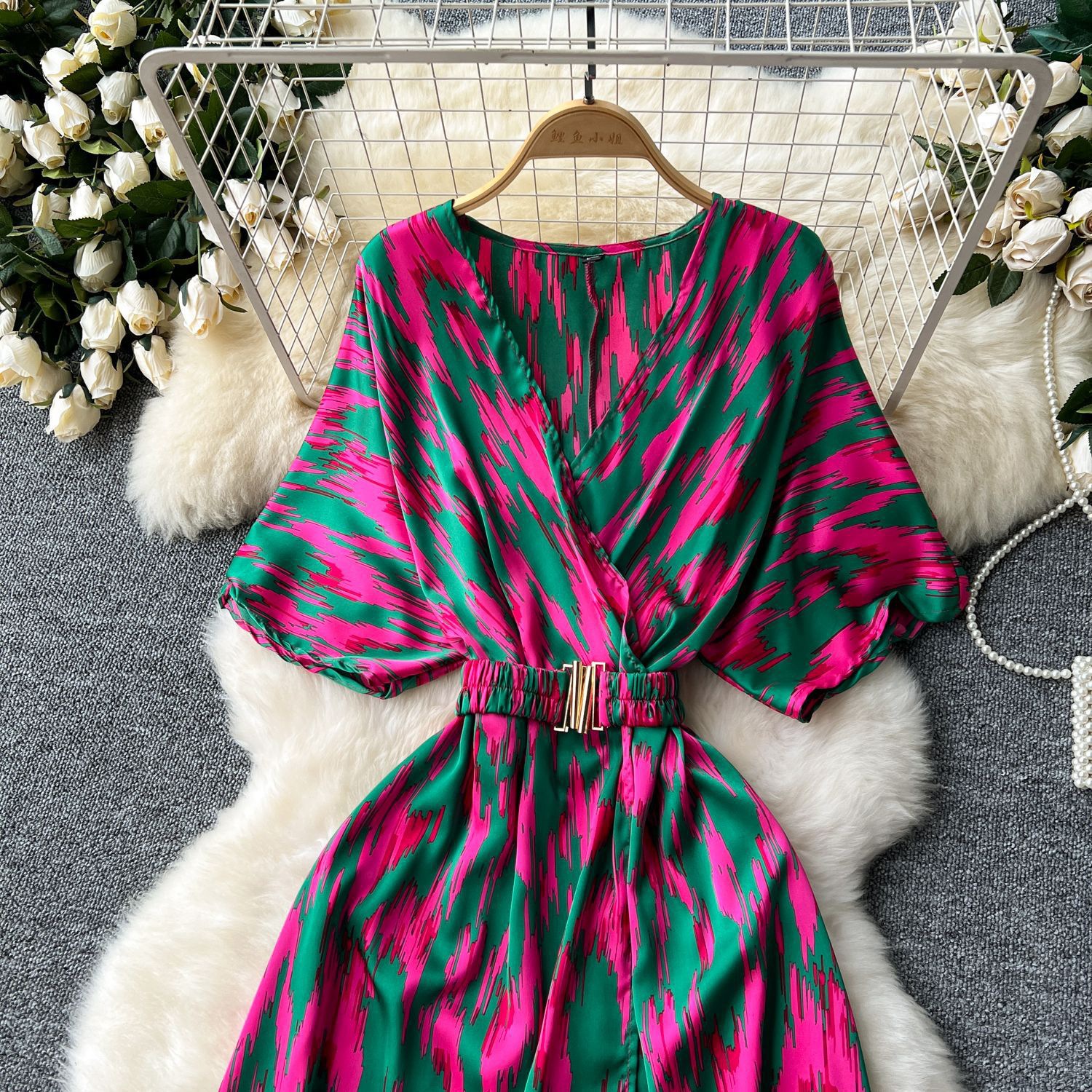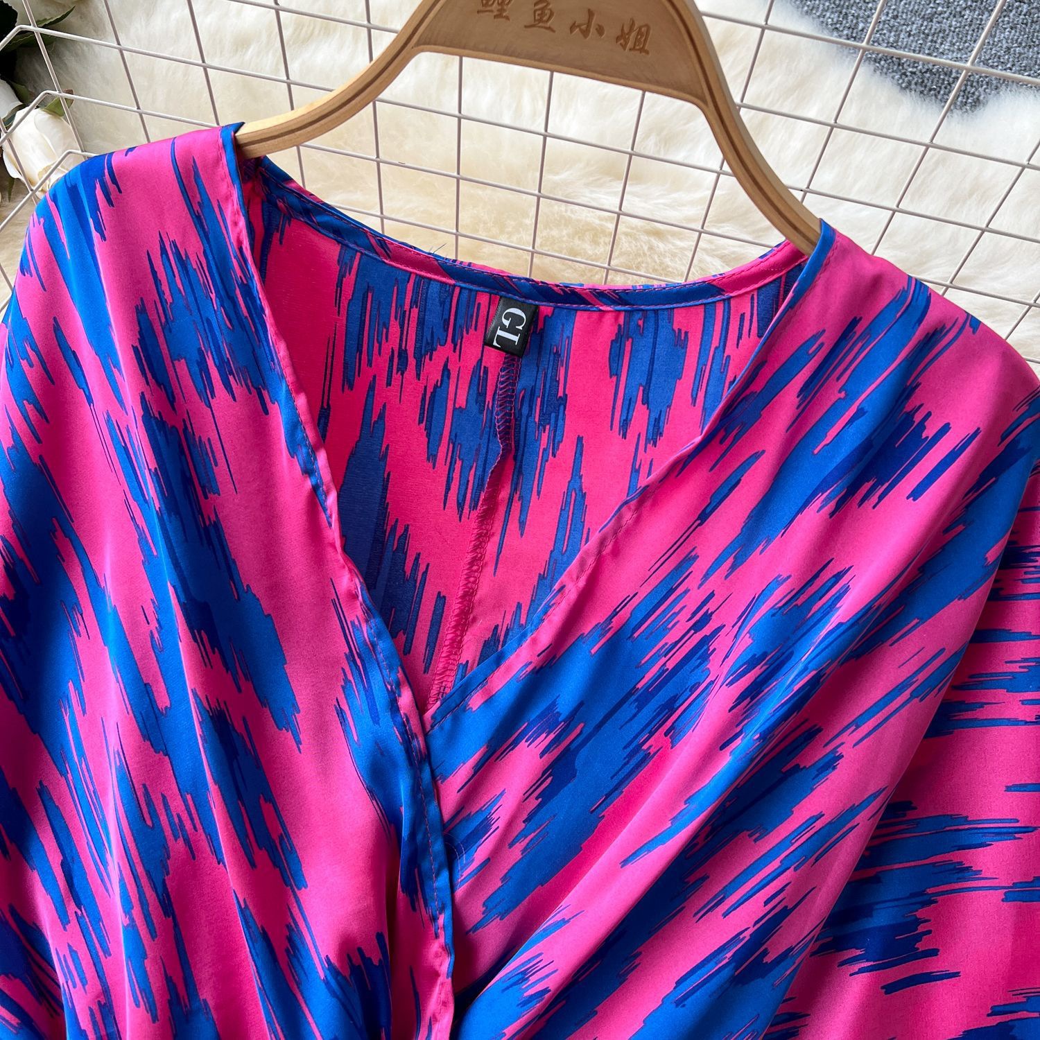 Summer new European and American style niche light luxury retro collar waist thin big swing split printing dress