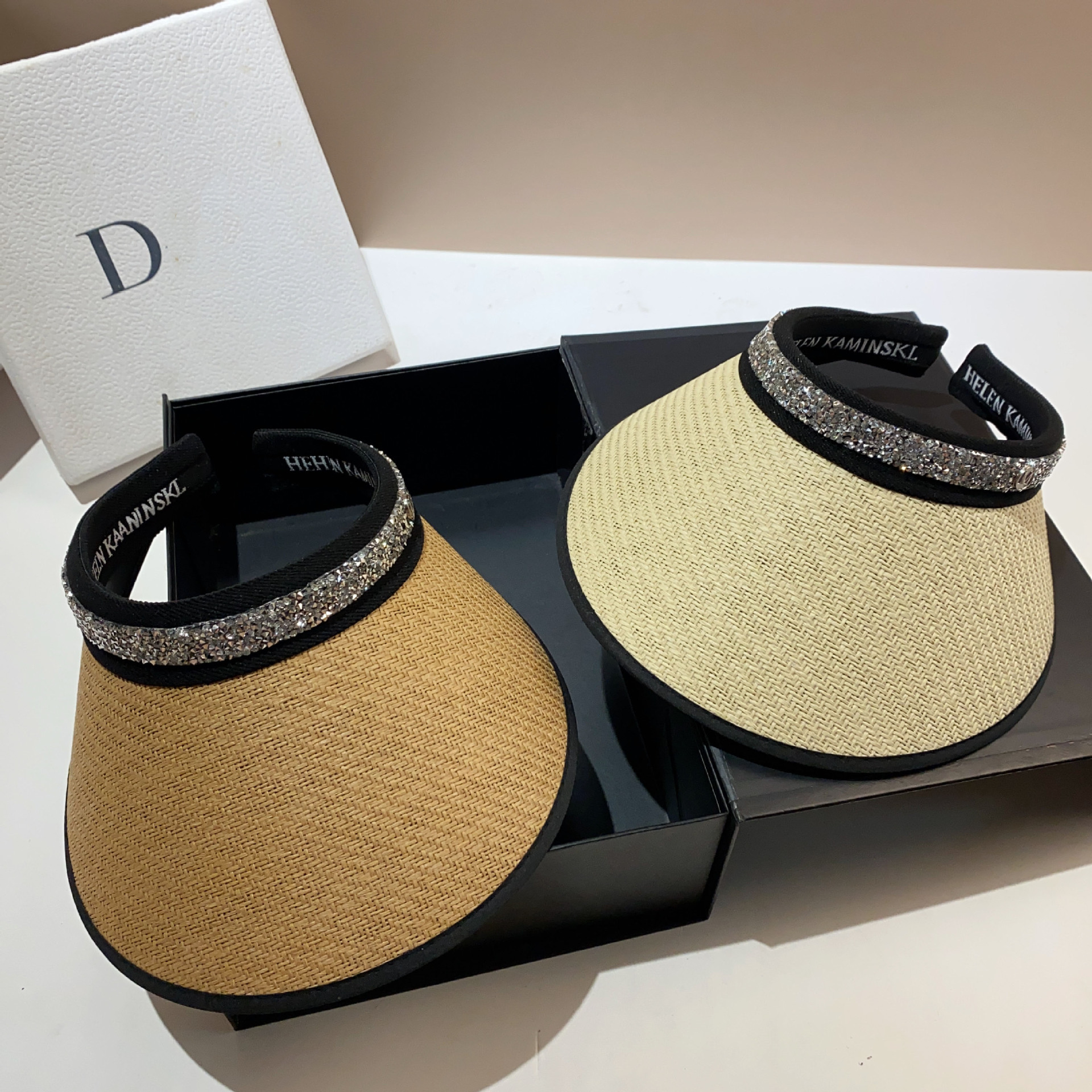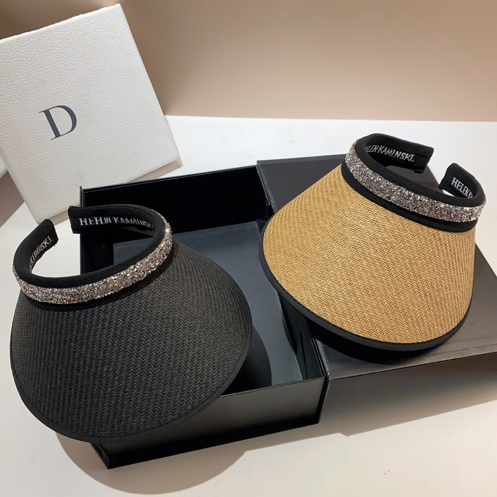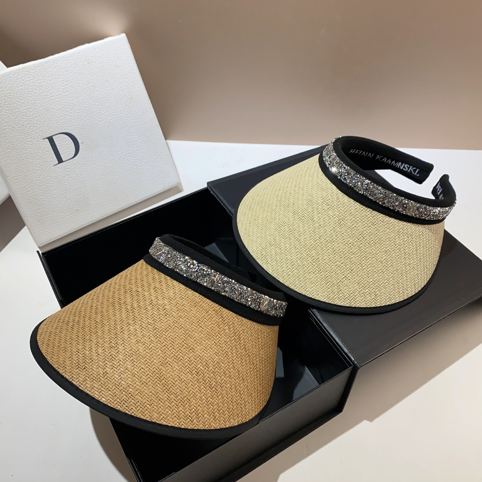 Summer vinyl straw double-layer sunscreen empty top hat fashionable and simple rhinestone fine flash trendy sunshade topless cap
